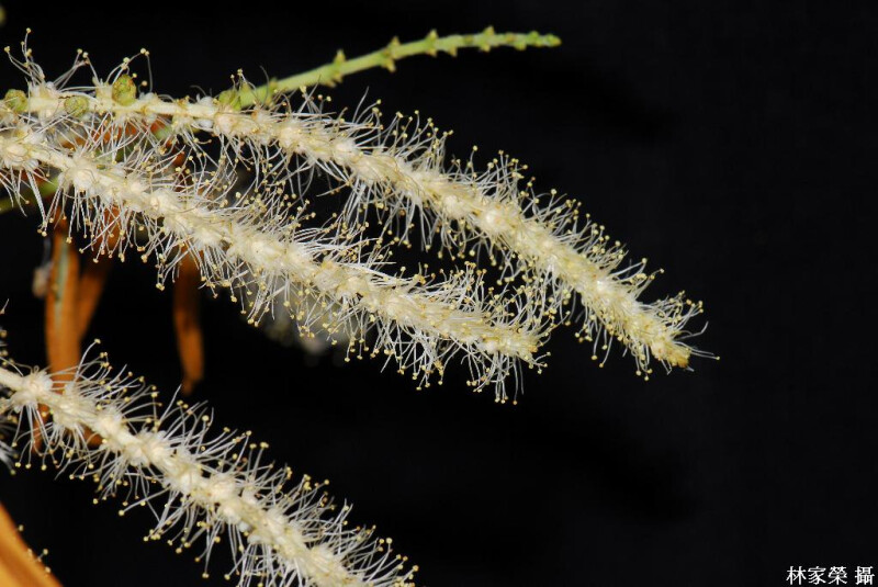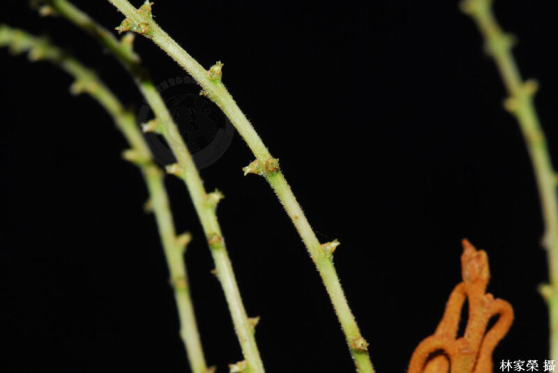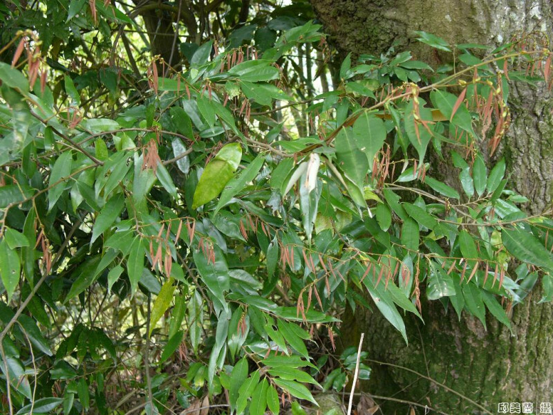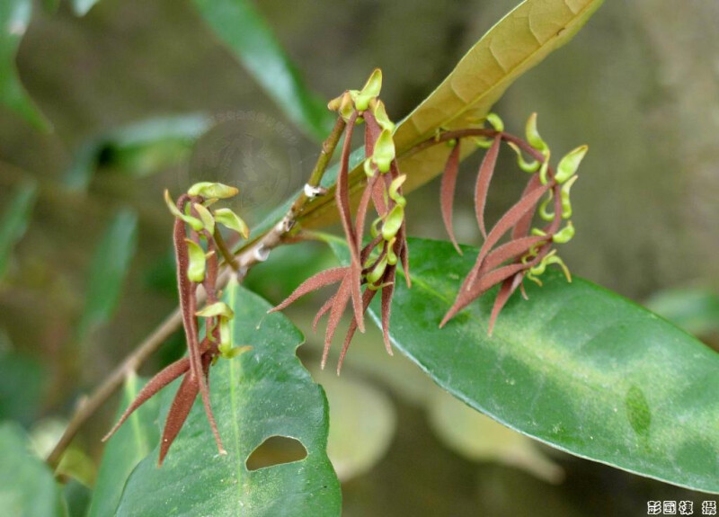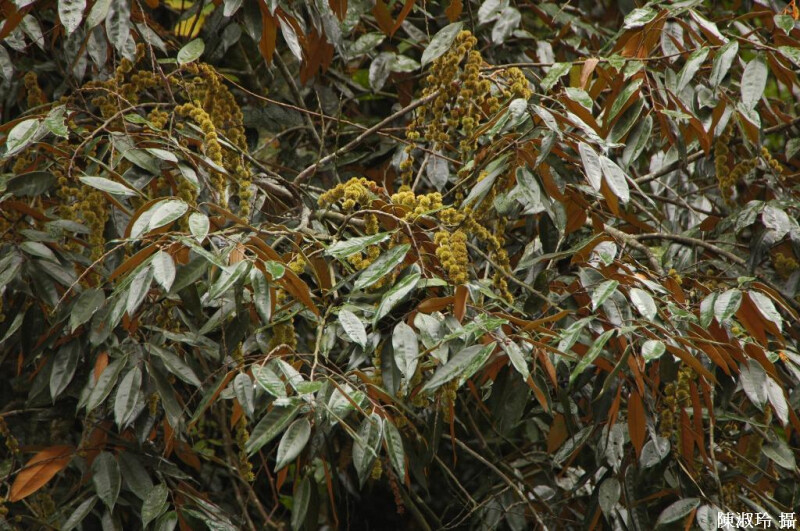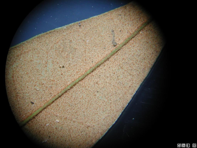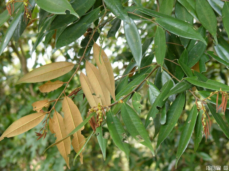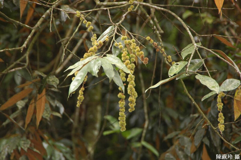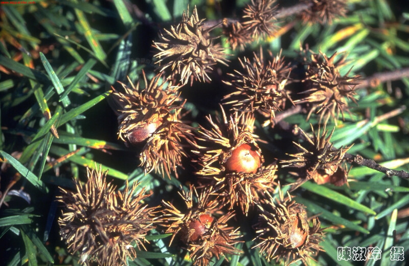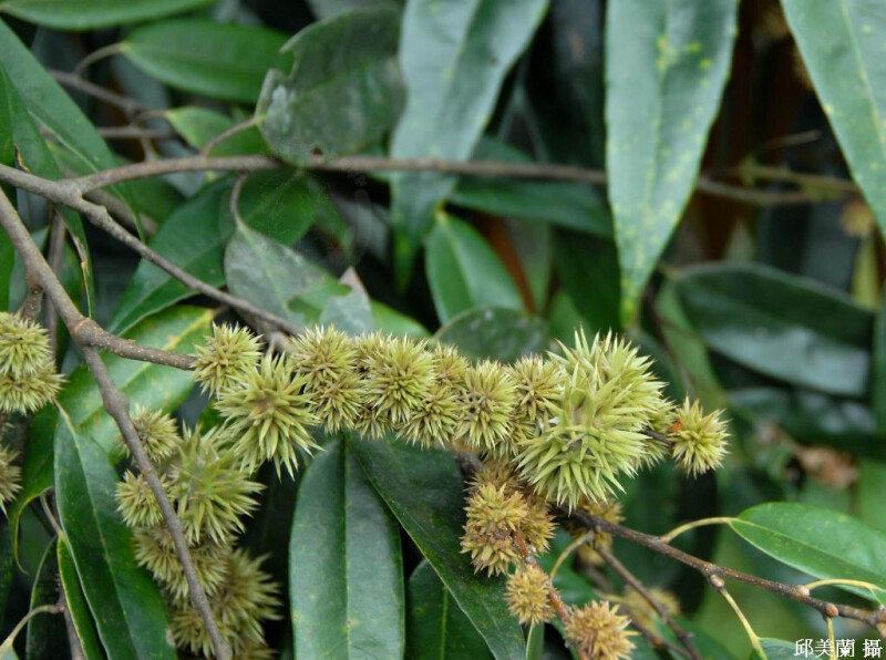 小枝被褐色鱗片。葉橢圓狀披針形,革質,全緣或僅近前端疏鋸齒緣,先端漸尖,基部銳尖至鈍,下表面被淡紅褐色鱗片。殼斗密被刺,刺直,稍彎曲。 (楊遠波、劉和義、呂勝由 1997)