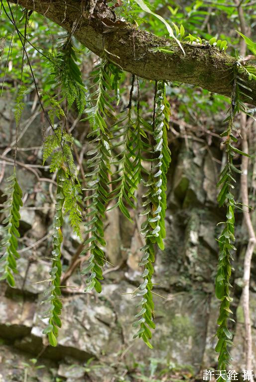 附生。莖扁平,懸垂。葉互生,長橢圓形,非肉質,先端頗圓。總狀花序側生,短,長約1 cm,約有4朵花。花黃白色。蒴果窄長,長約8-9 cm。 (林讚標 2001)