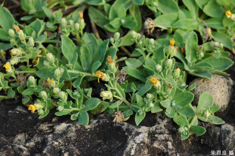 具長主根,主莖粗短,木質化;葉基生,蓮座狀。花莖長在側生的斜倚莖上而不直接長在主莖上,花莖基部葉蓮座狀簇生,葉厚革質,卵形至匙形。花莖10-40 cm高,頭花複排列為繖房花序,花冠黃色,直徑約1.5 cm寬。 (楊遠波、劉和義、施炳霖、呂勝由 1999)