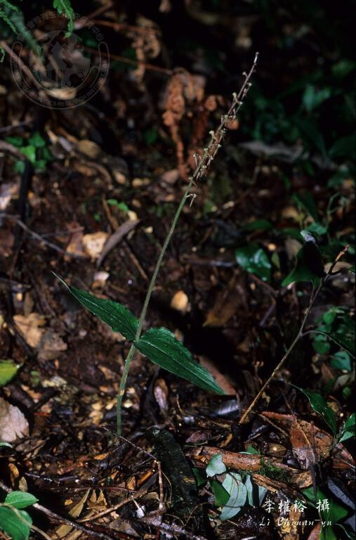 地生。葉2片,對生,三角形,無柄。花序頂生。花約10朵,呈鬆散排列之總狀花序,綠色或綠褐色,花序柄有短毛。 (林讚標 2001)
