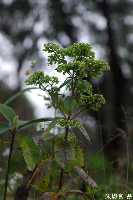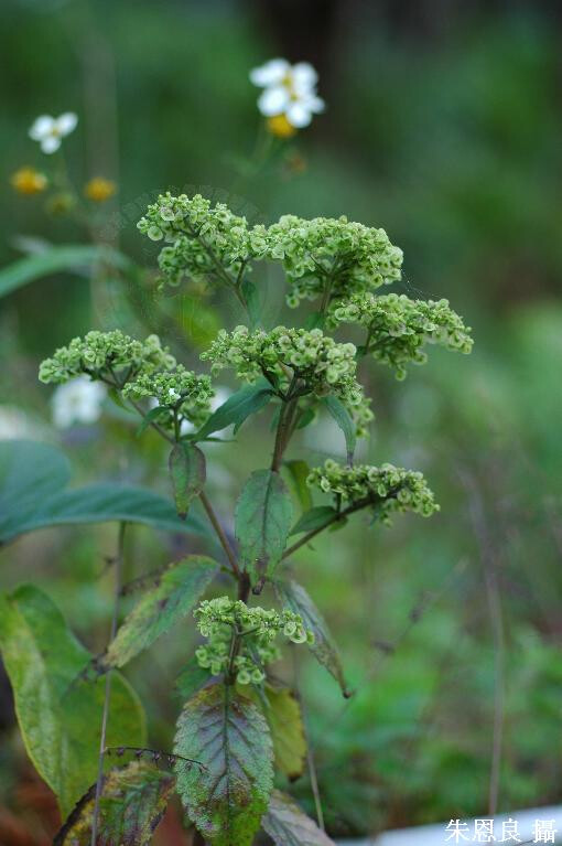 大型草本;莖直立,高達150 cm,基部木質化,密被倒生毛。單葉,對生,下方者闊卵形,長14-23 cm,寬4.5-8 cm,鋸齒緣,兩面被毛,上方者橢圓形,長4-9 cm,鋸齒緣,被毛。 (楊遠波、劉和義、施炳霖、呂勝由 1999)