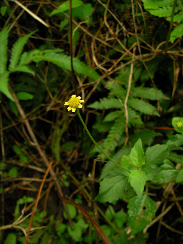 一年生草本,無毛。莖基部分枝,斜升或直立,高可達30 cm以上。葉對生,葉柄長1-2 cm,三出脈。頭花單一,頂生或腋生,總梗長2.5-16 cm;頭花筒狀,具90-200朵管狀小花,小花花冠黃色,4或5裂。瘦果冠毛為2不等長的剛毛。 (楊遠波、劉和義、施炳霖、呂勝由 1999)