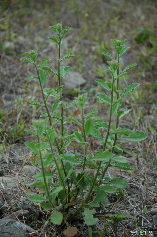 一年生直立草本,植株高70-80 cm,莖分歧或不分歧,密被銀色氈毛及腺毛。葉橢圓形或長卵形,10-12 ?e 3.5-4.5 cm,葉基下延,有時有柄,葉緣重鋸齒或有時成琴狀裂葉,上表面被絨毛,下表面被綿毛。頭花腋生及頂生,圓錐狀排列。總苞密被氈毛及多細胞腺毛。心花黃色。 (楊遠波、劉和義、施炳霖、呂勝由 1999)