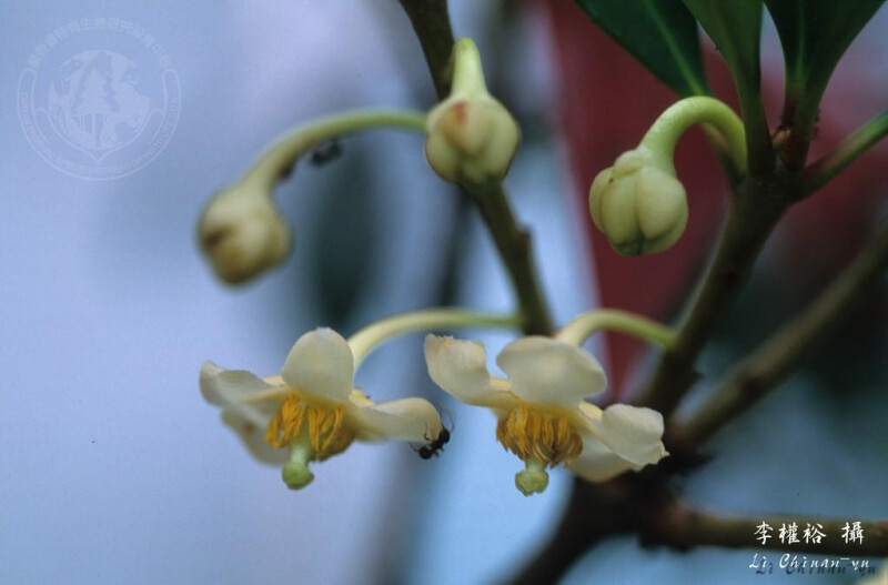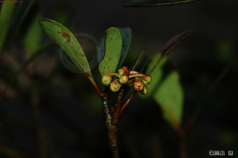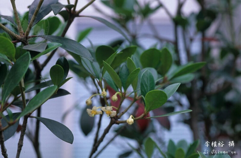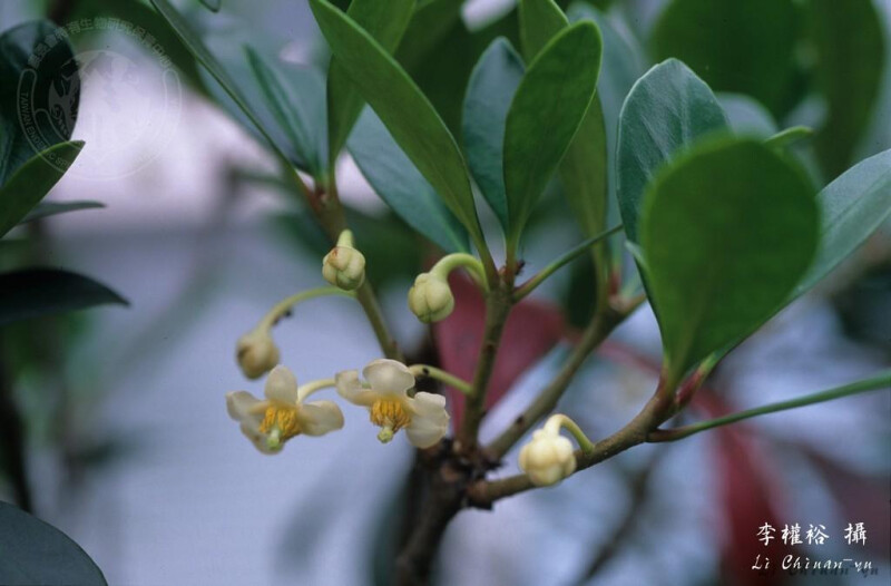小枝略具紅色。葉長橢圓形或長橢圓狀披針形,長 4-7 cm,全緣,先端鈍或圓,基部漸狹或楔形,全緣,兩面側脈不明顯。 (楊遠波、劉和義、呂勝由 1997)