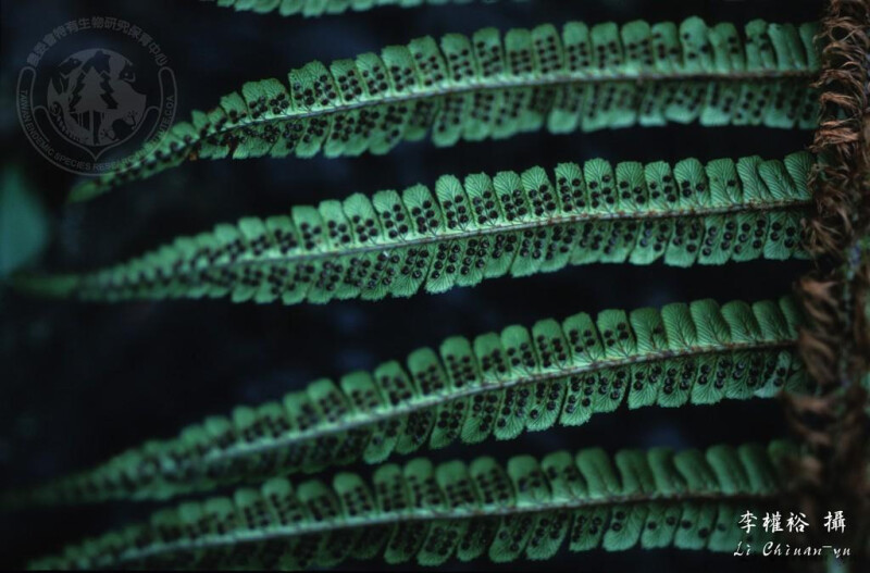 根莖粗,叢生,柄粗,20-30cm長,鱗片1-2cm長,薄,紅褐色,具暗色縱紋,葉50-100cm高,15-20cm寬,二回,最寬處在中段,下羽片短,最下一對羽片反折,羽片鈍,末端鋸齒。 (郭城孟 1997)