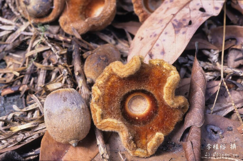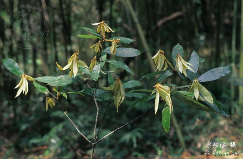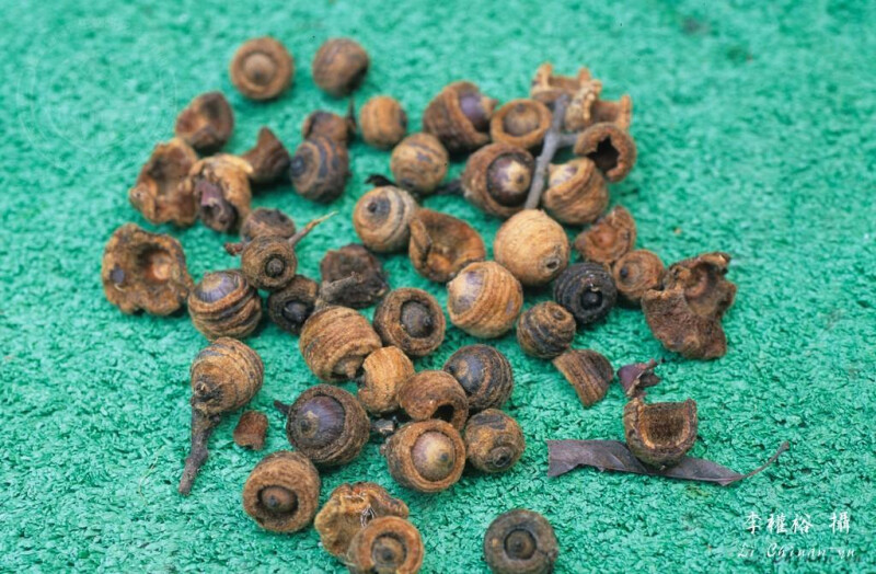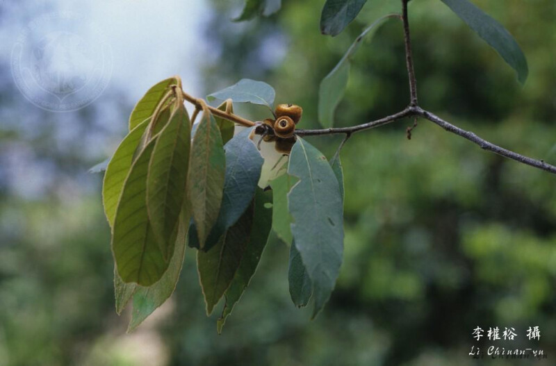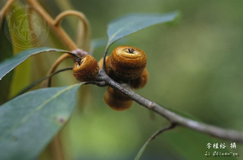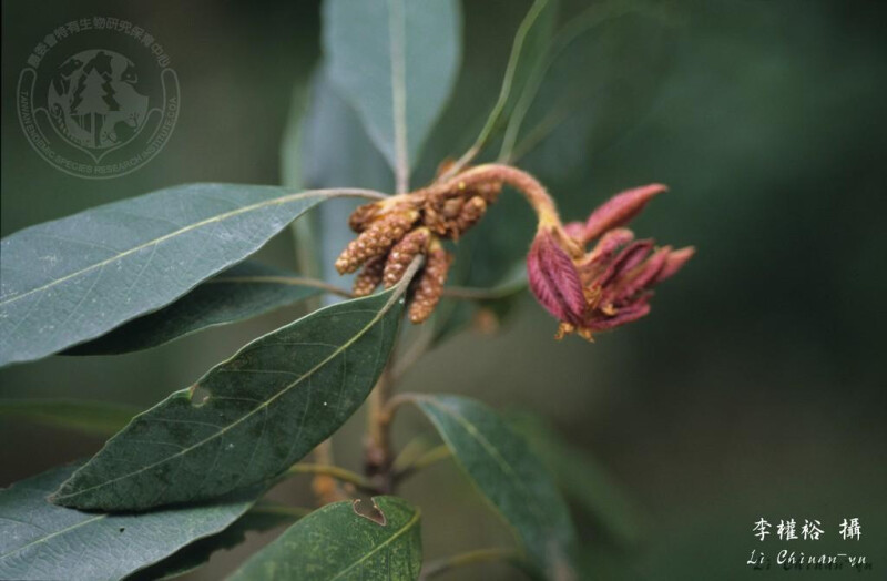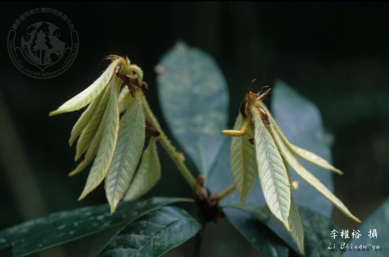 小枝與幼葉被紫色或金黃色綿毛;老枝光滑。葉革質,披針形或長橢圓狀倒卵形至長橢圓形,先端漸尖或銳尖,基部銳尖或楔形,或歪斜,全緣或前端疏齒緣,下表面淡灰白色;葉柄長1-3 cm。殼斗邊緣呈不規則波狀或平,具8-10環鱗片,被金黃色絨毛。 (楊遠波、劉和義、呂勝由 1997)