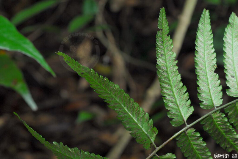 葉為一回羽狀複葉,羽片邊緣至多由葉緣與羽軸間的 1/2 處,羽片基部不具三角狀突起,羽片寬約 2 cm。 (郭城孟 1997)