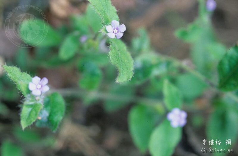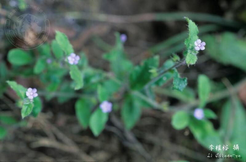 屬特徵:一至二年生草本。花單生,但在植物上部常成有葉的總狀花序。花瓣5,喉部具鱗片;小堅果瘤狀。 種特徵:匍匐性草本;全株被剛匐毛,葉毛基部有鈣化細胞。葉卵形至披針形,短於6 cm,邊緣微波狀。花瓣淺藍色或白色。 (楊遠波、劉和義、施炳霖、呂勝由 1999)