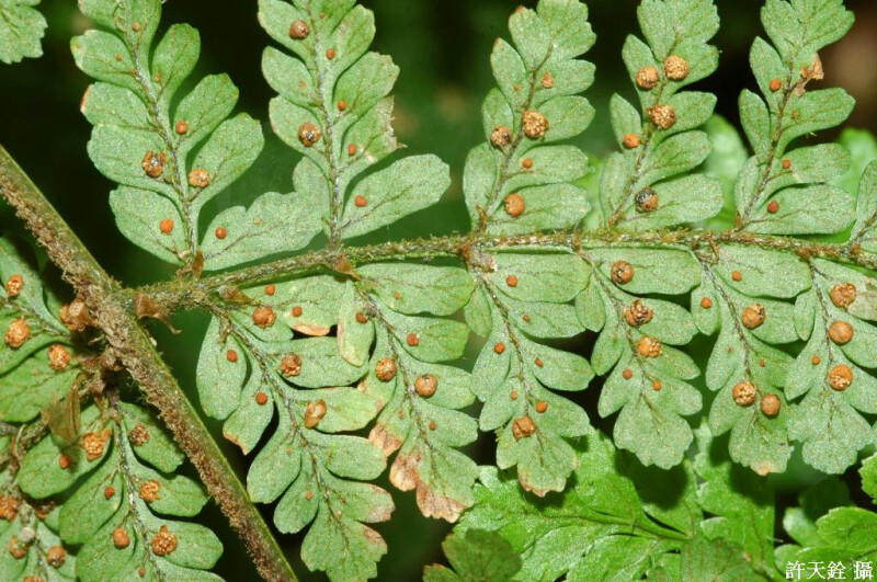 短走莖,柄長30cm,葉四回羽狀分裂,表面有毛,孢子囊群球形,不具柄。 (郭城孟 1997)