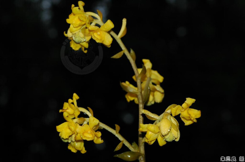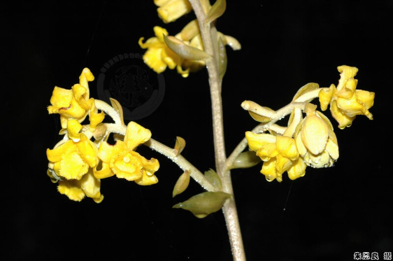 無葉綠素蘭。根莖甚粗。花序直立,1 m或更高,黃棕色,有分枝,具許多鱗片,花序軸被覆毛茸。花黃色,寬4.5 cm;萼片橢圓形,肉質;唇瓣基部具小囊。蒴果圓柱狀,甚長。 (林讚標 2001)