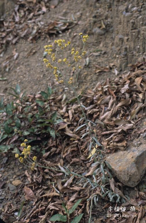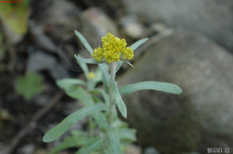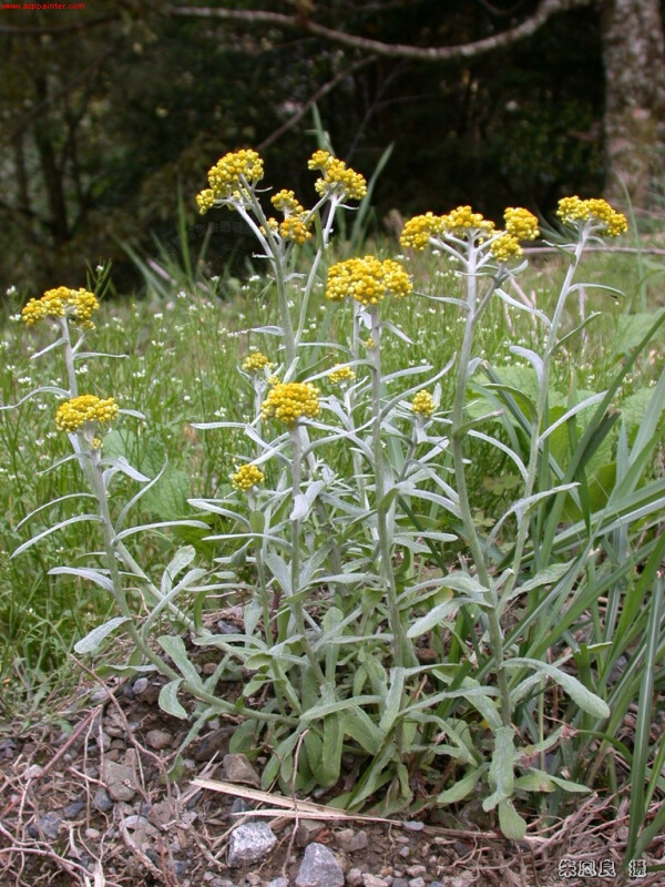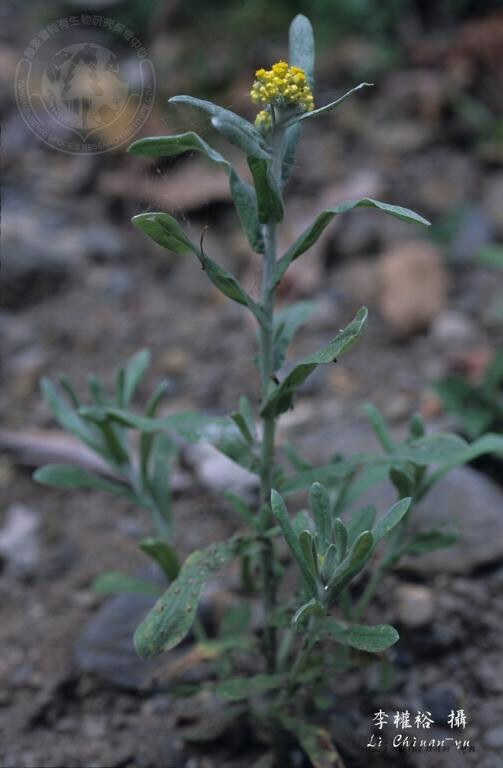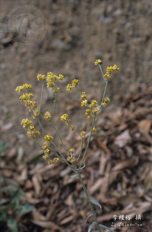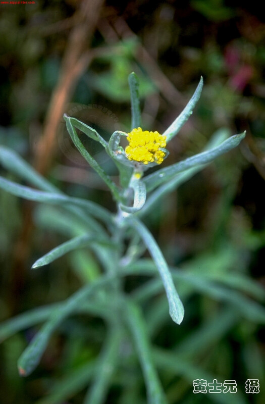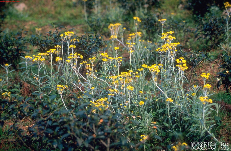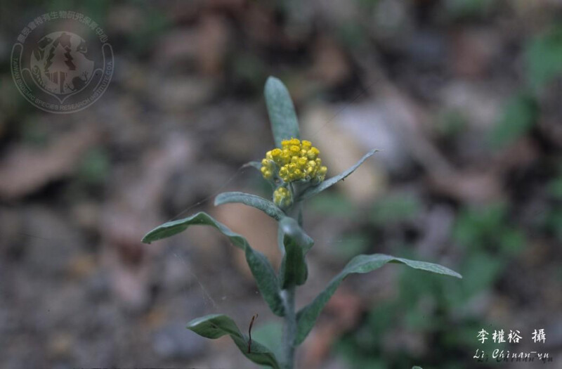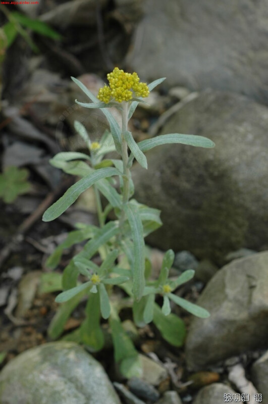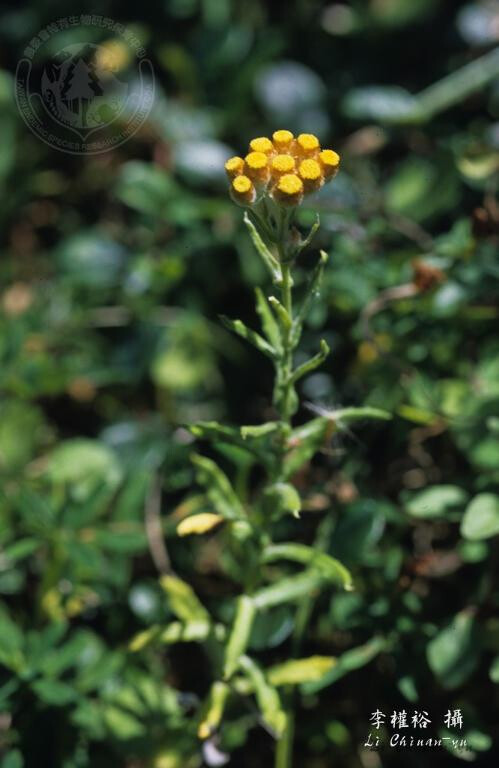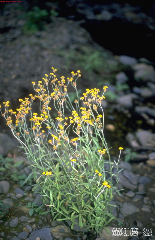 二年生草本。莖葉薄,匙形或倒披針形,先端突尖,兩面及莖密被白色綿毛。莖上部繖房狀分枝,頭花多數,具短梗或無梗,總苞片亮黃色。花期三至八月。 (楊遠波、劉和義、施炳霖、呂勝由 1999)