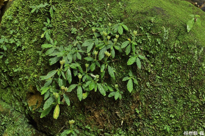 屬特徵:草本。莖多少肉質。葉對生,草質,羽狀脈;托葉葉柄間。花白色,繖房聚繖狀花序或花單一;萼筒短,裂片5;花冠輪狀,裂片5,苞時鑷合狀;雄蕊著生於花冠基部,花藥突出;柱頭頭狀,不伸出,子房2室,胚珠多數。蒴果。 種特徵:葉長橢圓形至橢圓形,長6-10 cm,表面近無毛,背面脈上密被毛,纖毛緣;葉柄長5-25 mm,被毛;托葉卵形至寬卵形。花單一或2-4朵聚繖花序;萼片外被毛,宿存;花瓣纖毛緣。 東部低海拔森林和河邊陰濕地。 (楊遠波、劉和義、施炳霖、呂勝由 1999)