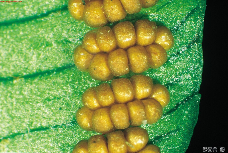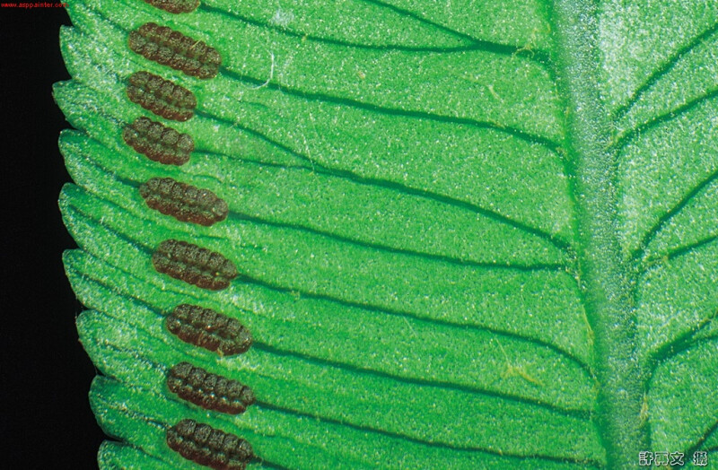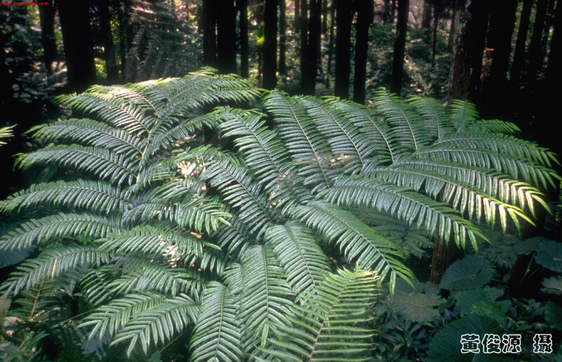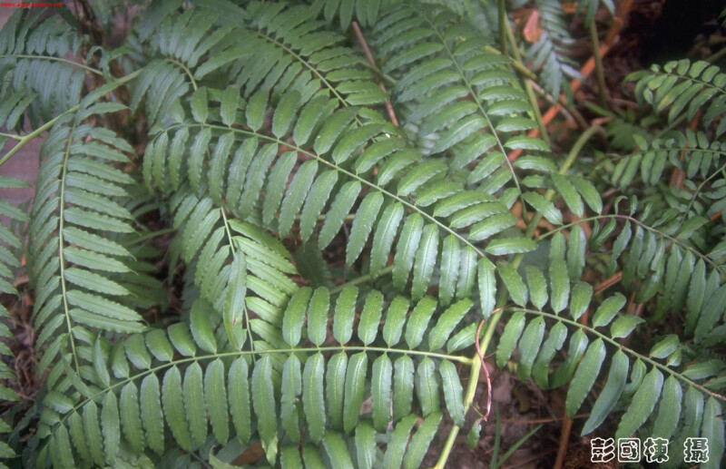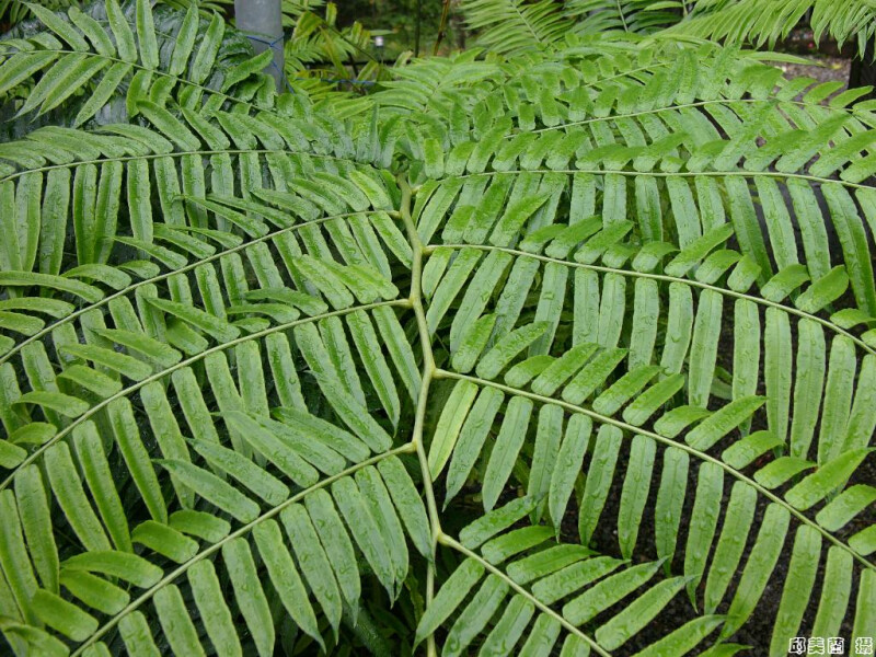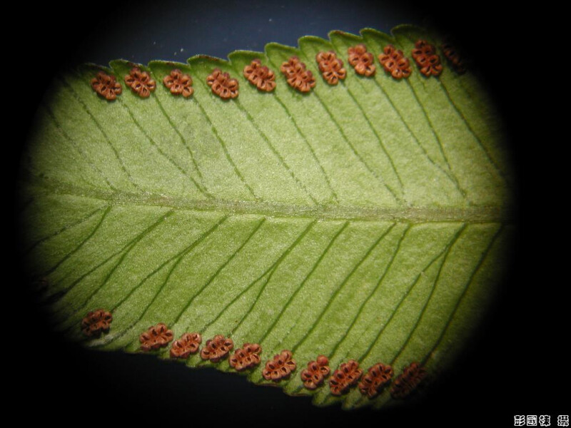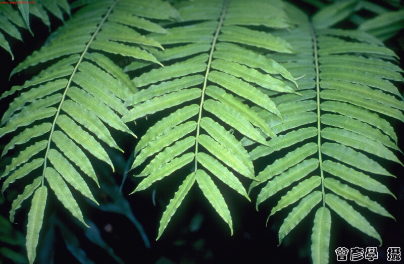 幼葉一回,柄上有關節,成熟葉二回,長2-3m,小羽片寬1-2cm,葉緣鋸齒,且每一脈對應一齒,回脈短,祇見於孢子囊側。 (郭城孟 1997)