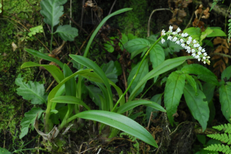 假球莖密集,球形,上具2片葉。葉線狀長橢圓形,銳頭,具關節。花序彎曲,自假球莖基部而出,纖細;穗狀花序具無數小花。花白色,不伸展,寬約5mm。 (林讚標 2001)