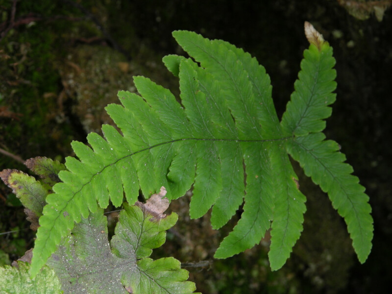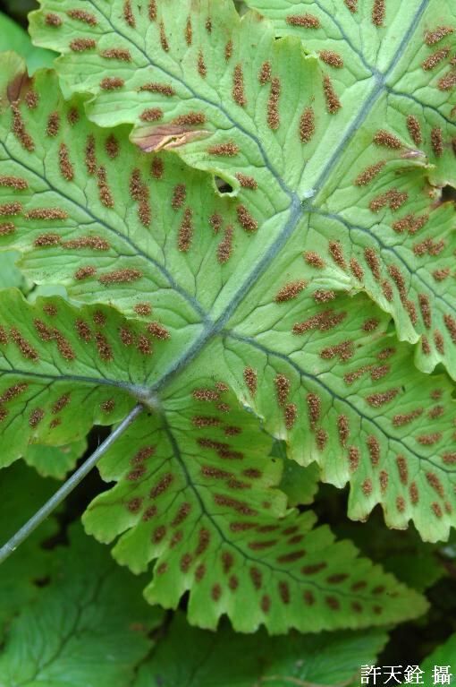 柄長10-20cm,近基部具鱗片。葉三角形,一回深裂,最下羽片多少鎌形,葉緣鋸齒,孢子囊群圓。 (郭城孟 1997)