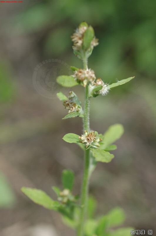 一年生草本。莖直立,不分枝或基部多分枝而成為斜升的莖,莖高10-50 cm,莖綠色,全株被灰白色的毛。基生葉早凋,莖葉倒披針形或匙形,2.5-8 ?e 0.4-1.8 cm,先端圓或鈍,上表面被蛛絲狀毛。頭花多數於葉腋成穗狀排列,花序長約1-3 cm,再排列為圓錐狀花序;花期十二月至次年六月。冠毛白色,於基部相連接成環。 (楊遠波、劉和義、施炳霖、呂勝由 1999)