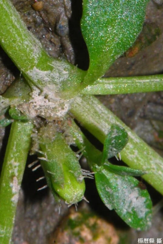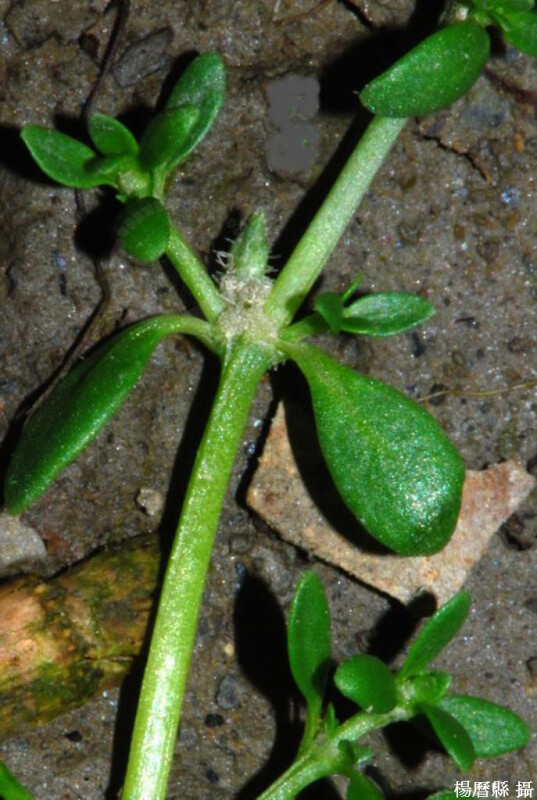 屬特徵:一年生匍匐性草本,常成蓆團狀。葉對生,近無柄,羽狀脈,側脈不清楚;托葉葉柄間,三角形。花單一,通常生於小枝的分叉上;萼筒近球形,裂片5;花冠鐘形,白色,裂片5,裂片每邊近先端2-3齒,苞時內曲鑷合狀;雄蕊喉部著生,內藏;柱頭線形二分叉;子房2室,胚珠多數。核果,乾質果肉。 種特徵:葉多少肉質,倒披針形至長橢圓倒卵形,長4-10 mm,僅背面主脈上被直柔毛。花萼長2-3 mm;花冠黃白色,長6-12 mm。果綠色。 中南部低海拔乾地和路旁。 (楊遠波、劉和義、施炳霖、呂勝由 1999)