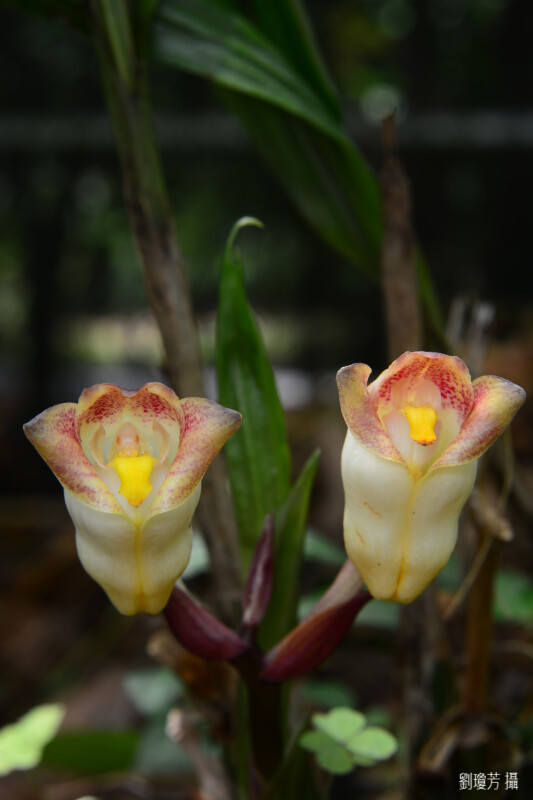 植物體叢生狀。假球莖卵形至圓柱狀。葉2或3片,折曲狀,橢圓形或長橢圓形。花序肉質,暗紫色,上端具3-5朵花。花甚大,長約4-4.5 cm,黃色淡瓣端暗紫。蒴果橢圓形,暗褐,有稜突,連柄長可達13 cm。 (林讚標 2001)