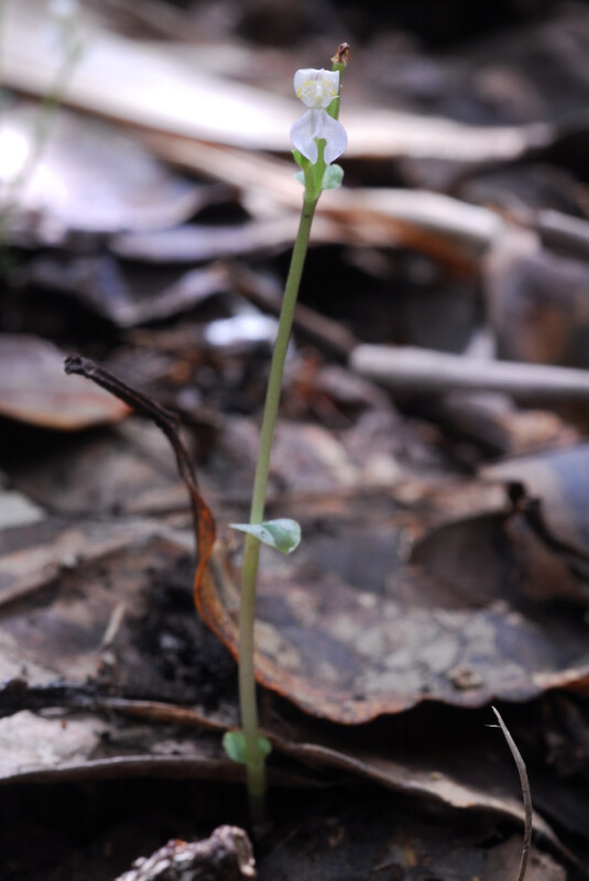 屬特徵- 地生,具塊莖。葉2或多片,無柄。頂生總狀花序具花2-3朵,或花單生。中萼片與花瓣合生成帽狀;側萼片中央具短距或囊;唇瓣基部具爪,十字形;花粉塊2,具柄及粘盤。 種特徵- 地生蘭。植物體無毛。球莖卵形,長5-8 mm。莖肉質,深紫至暗紫,多少呈角狀,其上具兩片疏遠的葉。葉心形,銳頭,略肉質,上表面淡綠,下表面紫色。花序頂生,僅開1-3朵花,每次僅開1朵。花粉紅色。蒴果狀暗紫色。 (林讚標 2001)