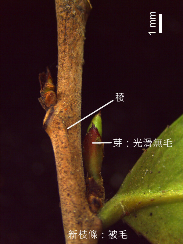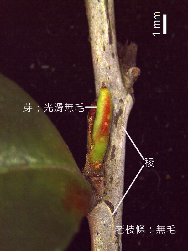 小枝密被毛,漸光滑;葉芽僅基部被毛。葉革質、倒卵形或倒卵狀長橢圓形,長 2-4 cm,先端圓或鈍,稀略凸,凹頭,下表面光滑。 (楊遠波、劉和義、呂勝由 1997)