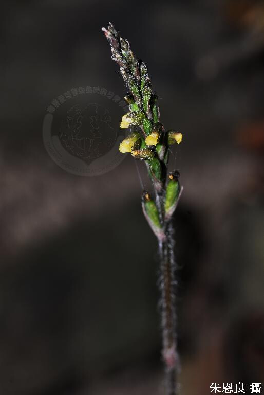 地生,根莖斜上。莖圓柱狀,暗紅色,向上轉成綠褐。葉橢圓形,銳頭。花序細長,花多而密。花甚小,寬3.5 mm,萼片綠褐,外被毛茸。唇瓣基部形成囊狀;唇片反捲,黃色,由2橫向之卵形至菱形裂片構成。 (林讚標 2001)