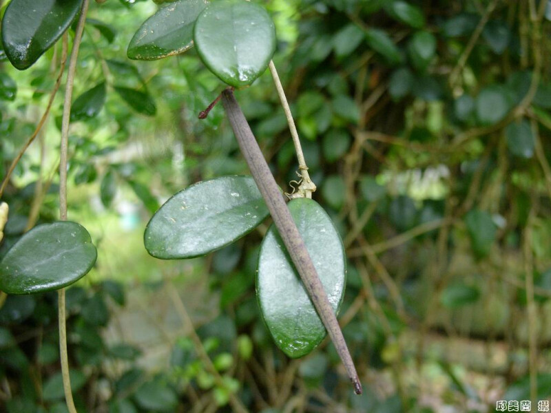 屬特徵:纏繞藤本。葉對生,肉質。聚繖花序呈繖形排列。花冠肉質或臘質,副花冠裂片肉質,具縱溝;花粉塊2。蓇葖果。 科特徵:葉橢圓形,長5-14 cm,先端鈍或圓,側脈不明顯,基部具2腺體。 (楊遠波、劉和義、施炳霖、呂勝由 1999)