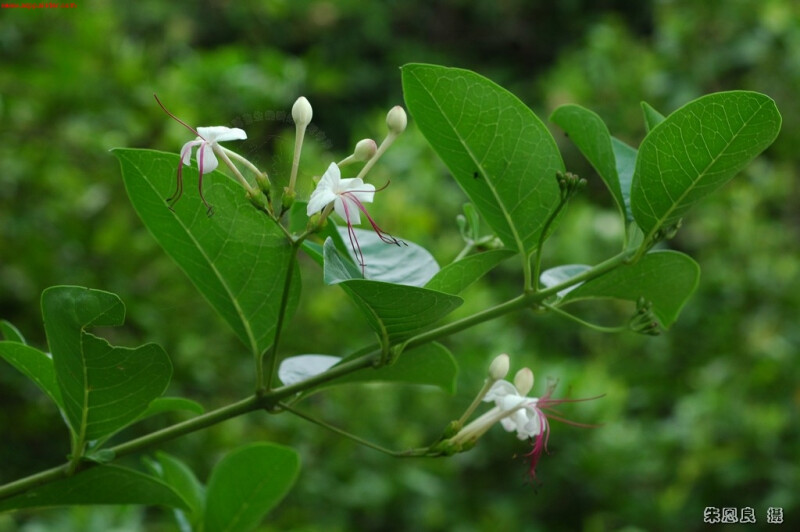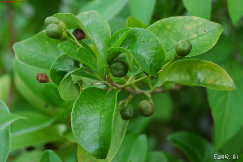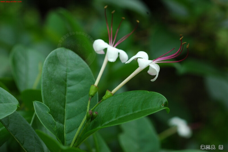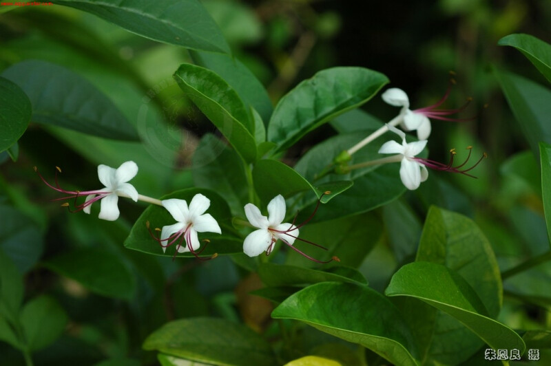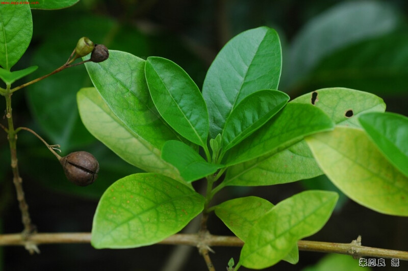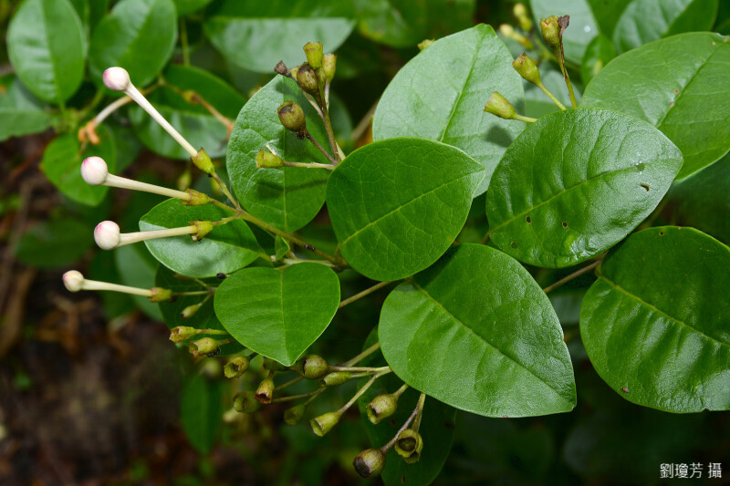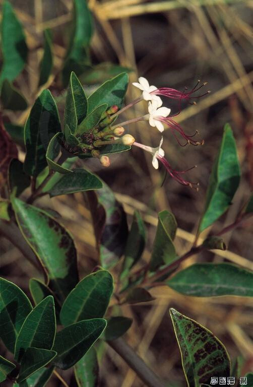 援狀灌木,小枝被毛。葉革質,卵形或橢圓形,3-8 cm長,1.5-4 cm寬,兩端銳至鈍。 聚繖花序通常具3朵花。花萼淺齒狀;花白色, 花冠筒約2 cm長;花絲紫紅色。果倒卵形至近球形。 (楊遠波、劉和義、施炳霖、呂勝由 1999)