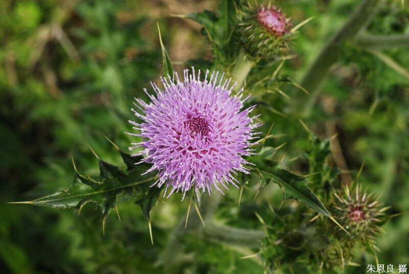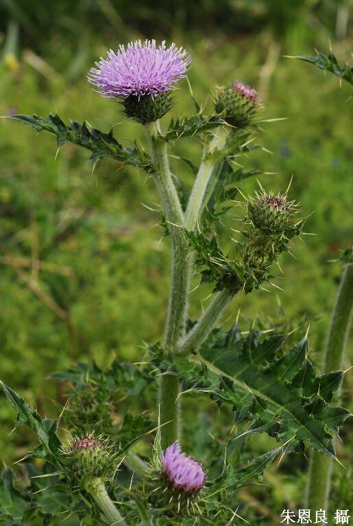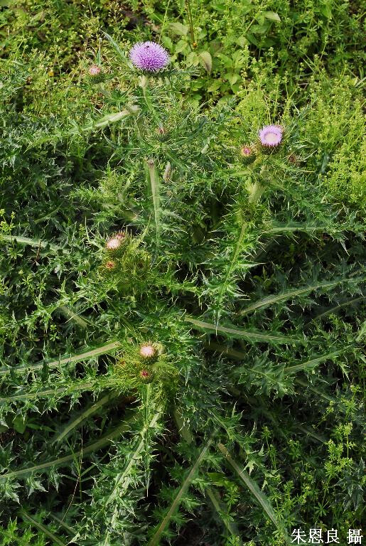 莖多分枝,密被長柔毛。葉披針形,先端銳尖,葉基下延、抱莖,葉緣羽狀全裂,多刺,上表面密被毛,下表面沿著葉脈密生毛。總苞片貼伏,先端開展。頭花花冠紫紅色。 (楊遠波、劉和義、施炳霖、呂勝由 1999)