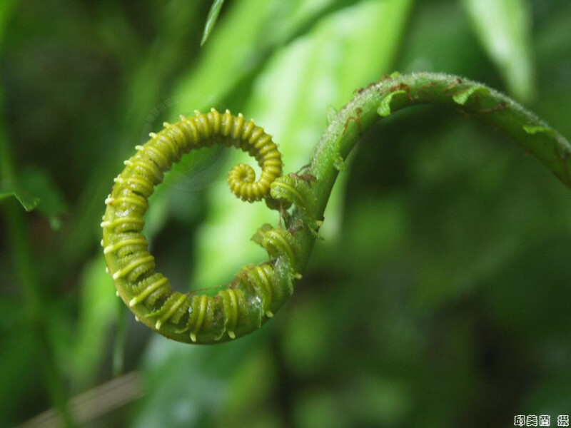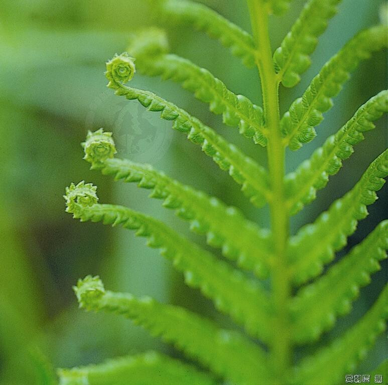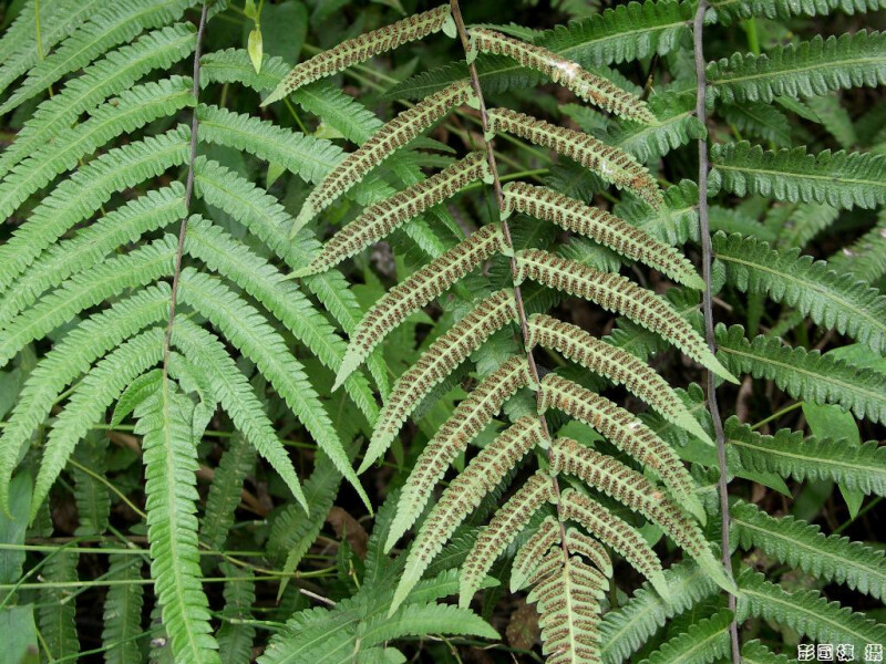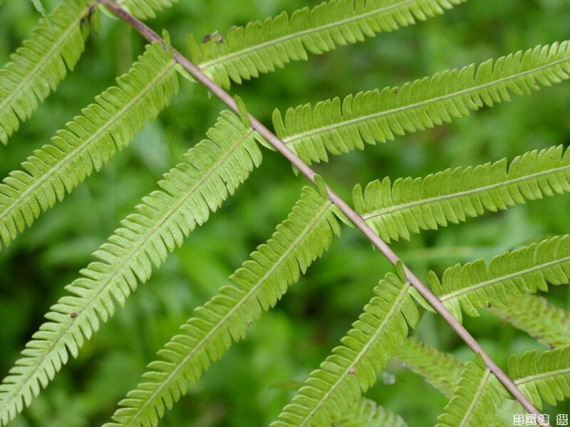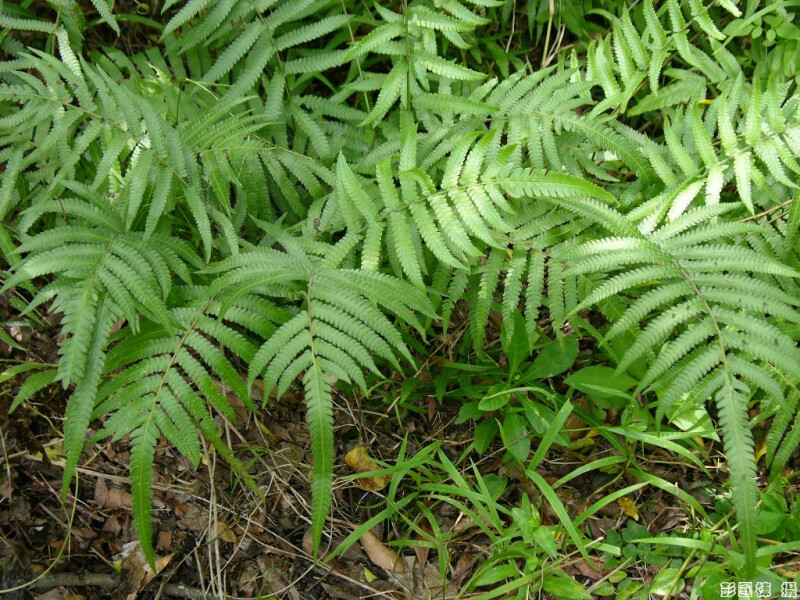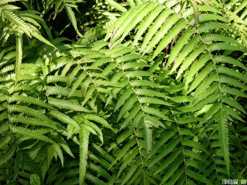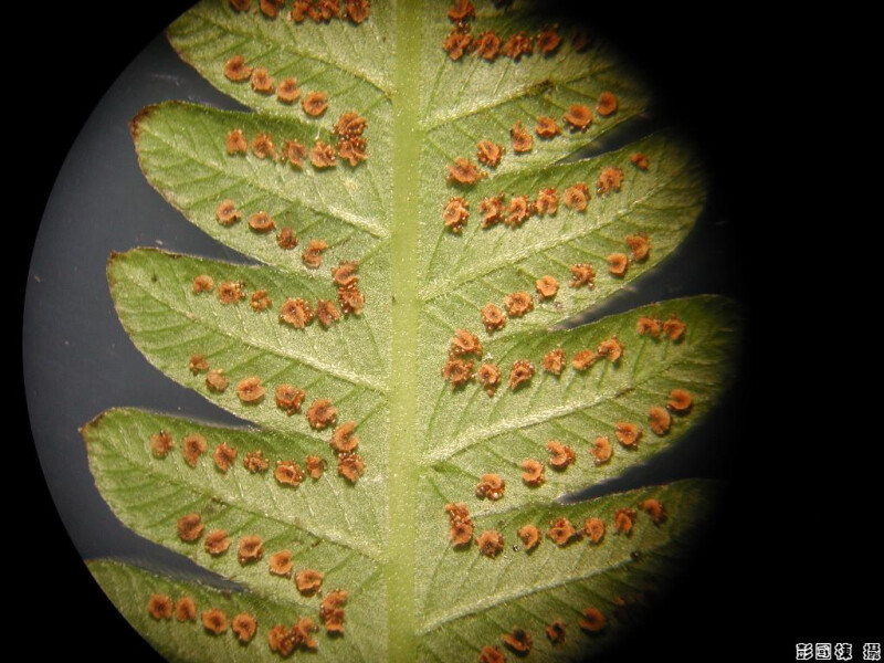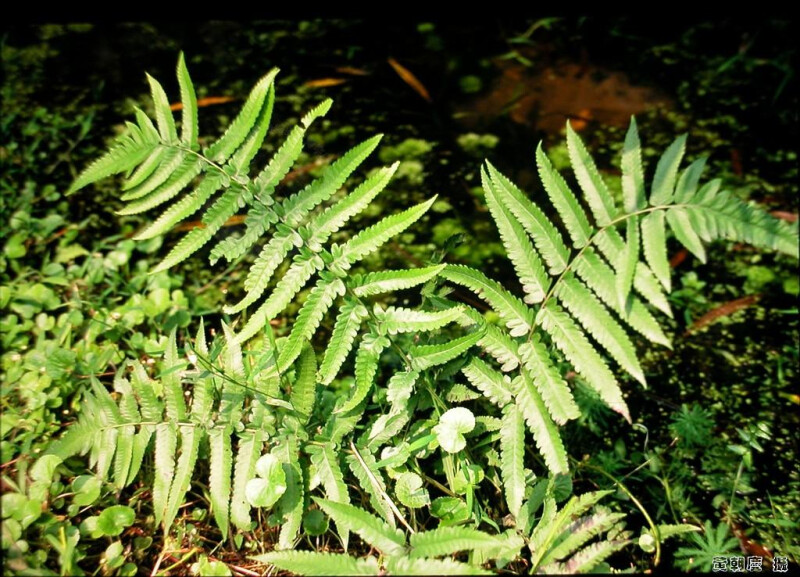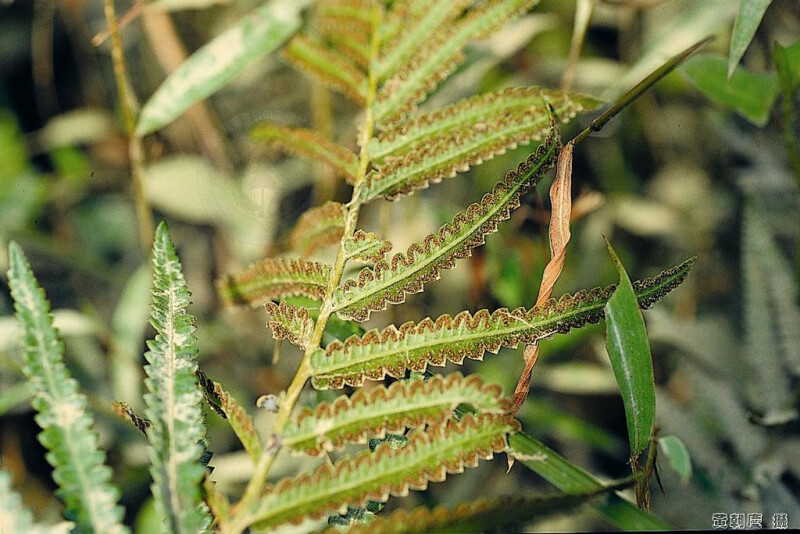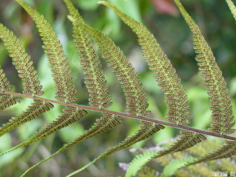 長走莖,葉兩側大致平行,約10 cm寬,頂羽片長。小羽軸側脈數對,約1-2對連合,形成小毛蕨脈型。長走莖,葉兩側大致平行,約10 cm寬,頂羽片長。小羽軸側脈數對,約1-2對連合,形成小毛蕨脈型。 (郭城孟 1997)