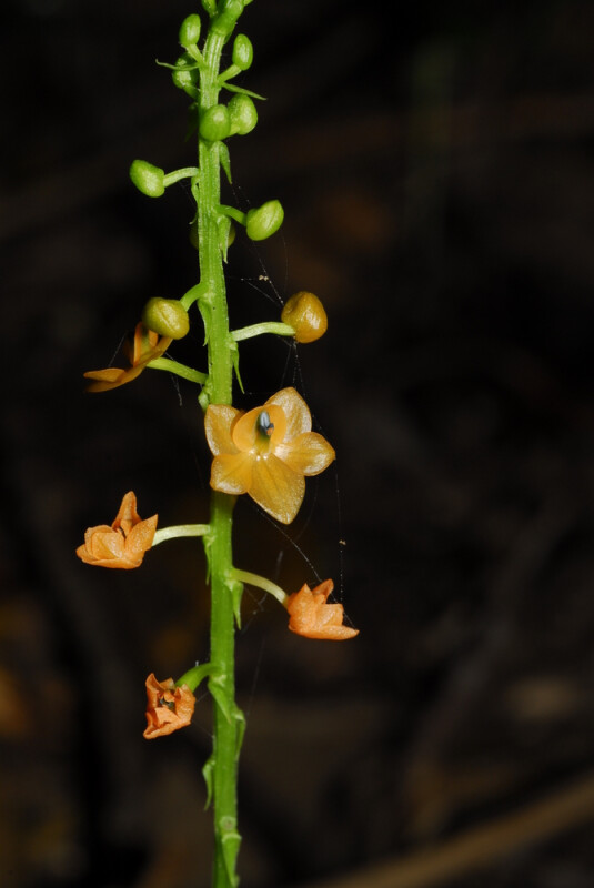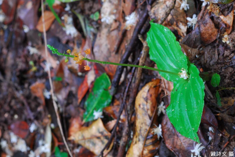 地生草本。植物體高3-5 cm。葉常2片,近乎對生,歪斜橢圓狀卵形,折曲狀,淡綠色。花序頂生,纖細,綠色。花不轉位,橘色,每次開2-3朵,逐次開放,寬8 mm,萼片及花瓣幾乎排列於同一平面上。 (林讚標 2001)
