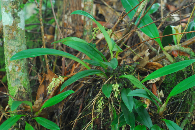 假球莖長卵形,光滑,成熟時由綠色漸轉為綠褐色或褐色。葉單生,帶狀長橢 圓形,厚革質,葉表面深綠色,下表面白綠色。花莖長約12 cm,纖細,總狀花序,長1.2 cm。 (林讚標 2001)