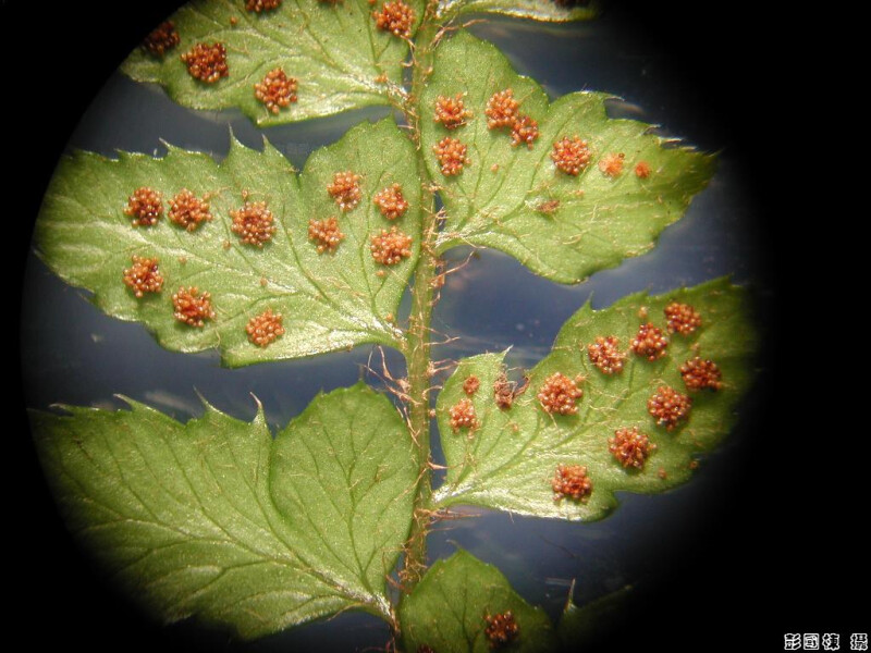 游離脈,葉緣鋸齒,多少有芒刺,一回羽狀複葉,羽片長寬比2,羽片邊緣不反捲,羽軸頂端有芽,葉草質,孢膜大,直徑大於2mm,葉脈末端無泌水孔。 (郭城孟 1997)