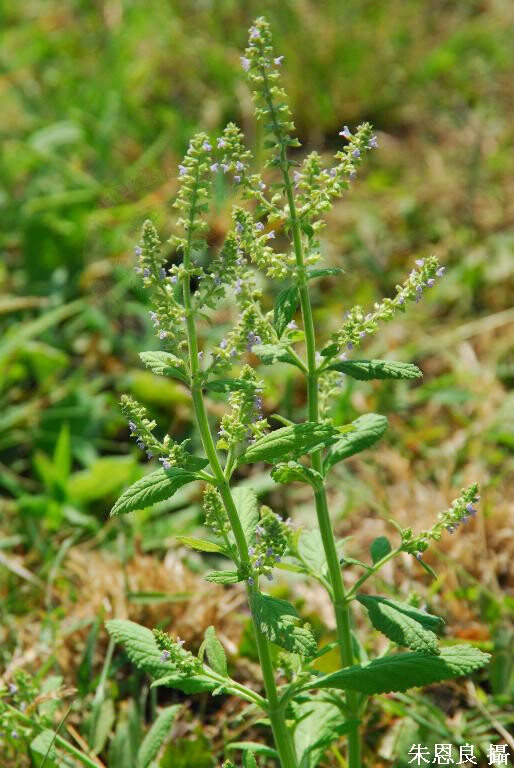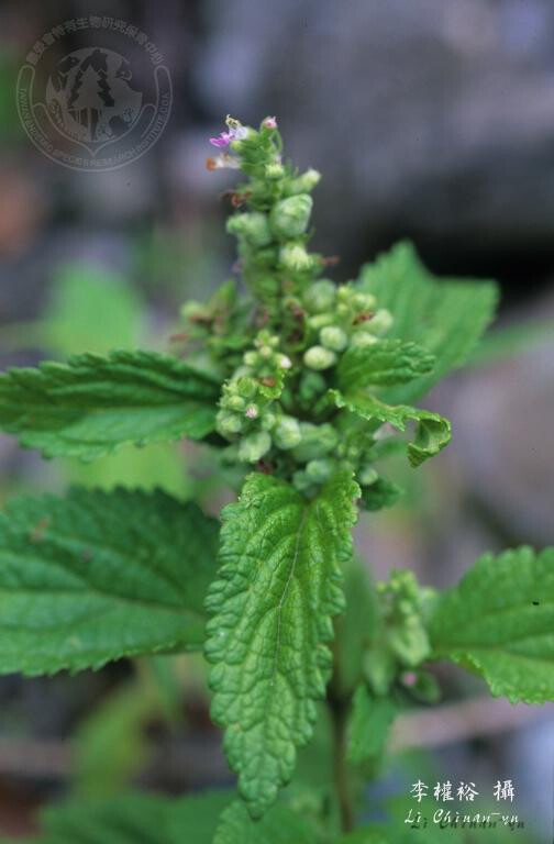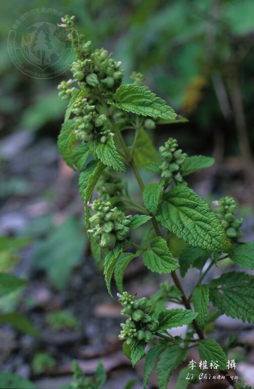 葉片卵形,長4-7 cm,寬2-4 cm,先端銳尖,基部楔形至圓形,鋸齒緣或雙鈍齒緣,兩面疏被毛;葉柄長1-3 cm。花萼下唇較長,2裂,上唇3裂,裂片約略相等,先端銳尖。 (楊遠波、劉和義、施炳霖、呂勝由 1999)