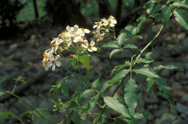 莖疏生倒刺。小葉常5 (稀3);小葉片橢圓形,長3.5-6 cm,寬2-2.8 cm;葉軸光滑或疏生倒刺。花多數,成繖房花序,白色;萼裂片尾狀漸尖,兩面被毛;花瓣倒卵形。果球形,光滑。 (劉和義、楊遠波、呂勝由、施炳霖 1998)