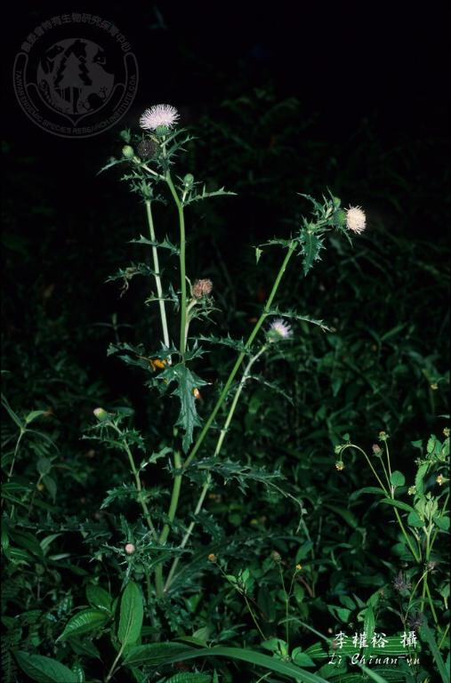 莖多分枝,密被毛。葉厚,長橢圓形,先端鈍,葉基漸狹成為翼狀葉柄,抱莖,葉羽狀全裂,裂片7或8對,葉緣缺刻齒狀,刺3-4 mm,兩面被毛。頭花頂生,總苞下方有3或4枚苞片狀的葉,長2-4 cm。總苞片革質;花冠白色。 (楊遠波、劉和義、施炳霖、呂勝由 1999)