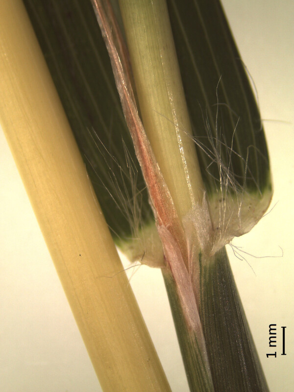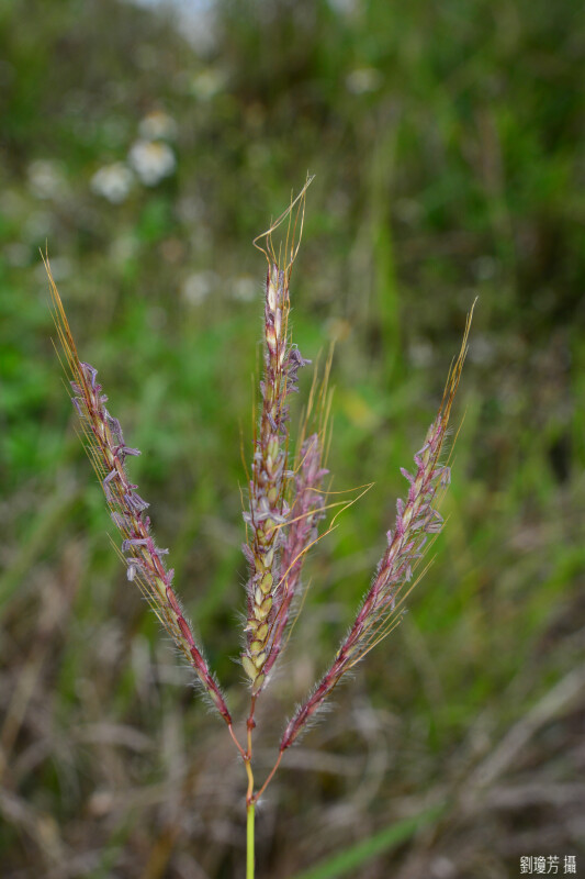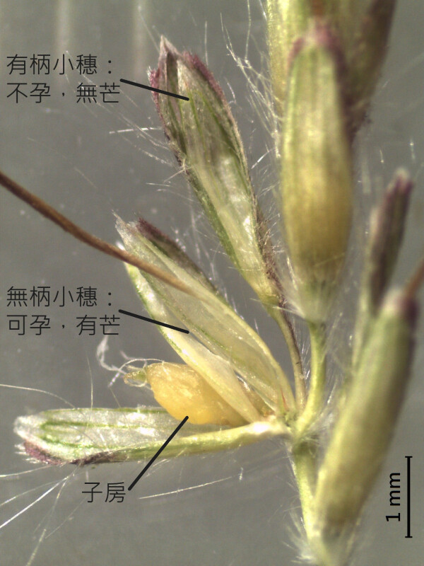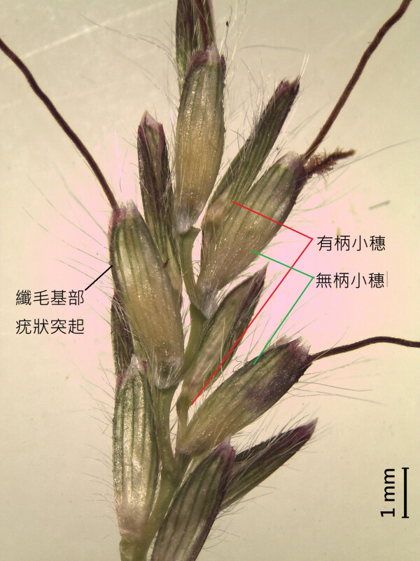 葉片表面具疣毛。總狀花序2-8枚,灰紫色。無柄小穗長約3 mm;外穎紙質,5脈,背部下方具纖毛;內穎紙質,背面具1龍骨。 (楊遠波、劉和義、郭長生、陳志輝 2001)