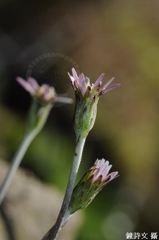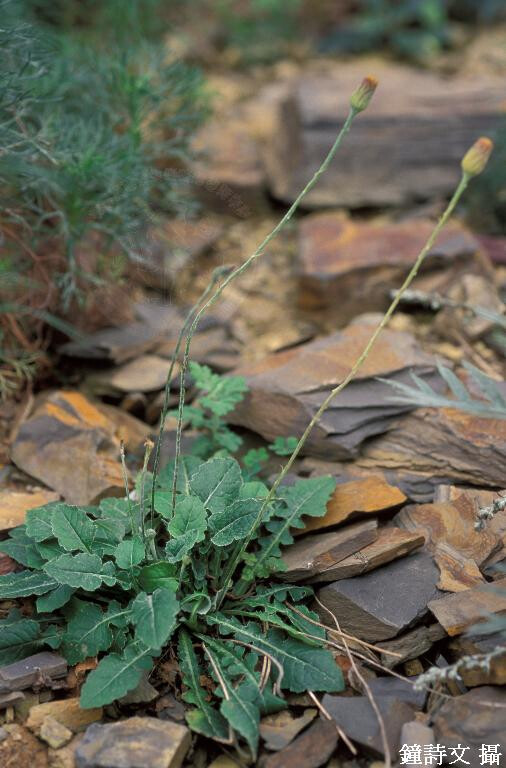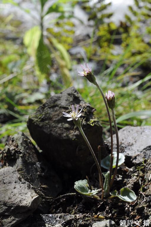 屬特徵:多年生草本,花莖葶狀,葉蓮座狀,羽狀裂片。輻射狀頭花頂生於長的花莖上,花莖被鱗片狀葉;舌花雌性,可稔或不可稔,花冠三裂。瘦果紡錘形,稍扁平,被毛。冠毛多數糙毛狀,宿存。 種特徵:春秋兩季長出高度不同的花莖,春季花莖高8-20 cm,秋季花莖高達60 cm,花莖密被蛛絲狀毛。基生葉倒卵形至倒披針形,5-16 ?e 1.3-4.5 cm,琴狀羽裂,葉緣突齒狀。頭花直徑1.5 cm,舌狀花花冠白色,外緣紫紅色,花冠兩裂。 (楊遠波、劉和義、施炳霖、呂勝由 1999)