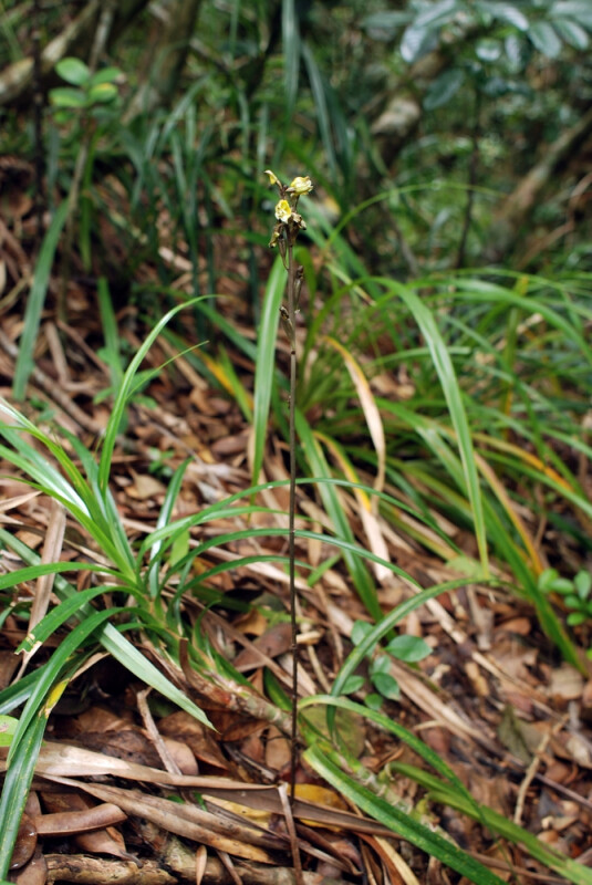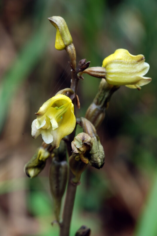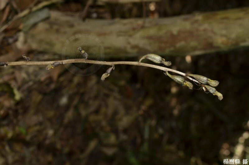 根莖圓柱狀。花可達15朵,長約1.3 cm,寬1.1 cm;萼片與花瓣除頂端3 mm部分離生外均連生;側萼片開裂幾達基部;花外面灰褐或黃綠色,在花被中脈處具紫褐條紋。蒴果圓柱狀,暗綠色,結果時花柄並不伸長。 (林讚標 2001)