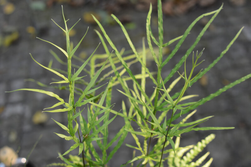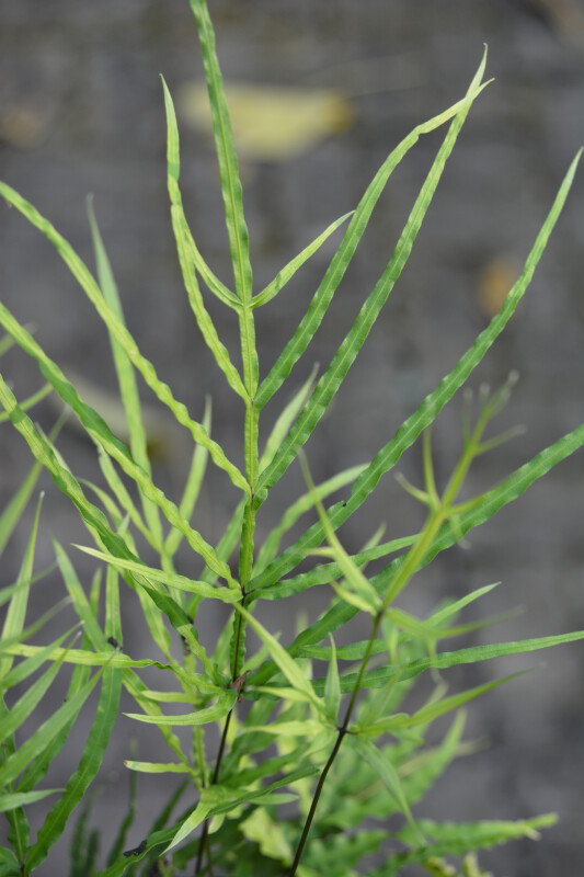 頂羽片單一,側羽片多少分叉,形成不規則多裂,羽軸兩側之羽片不對稱,葉軸有翅。 (郭城孟 1997)