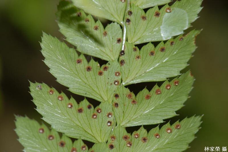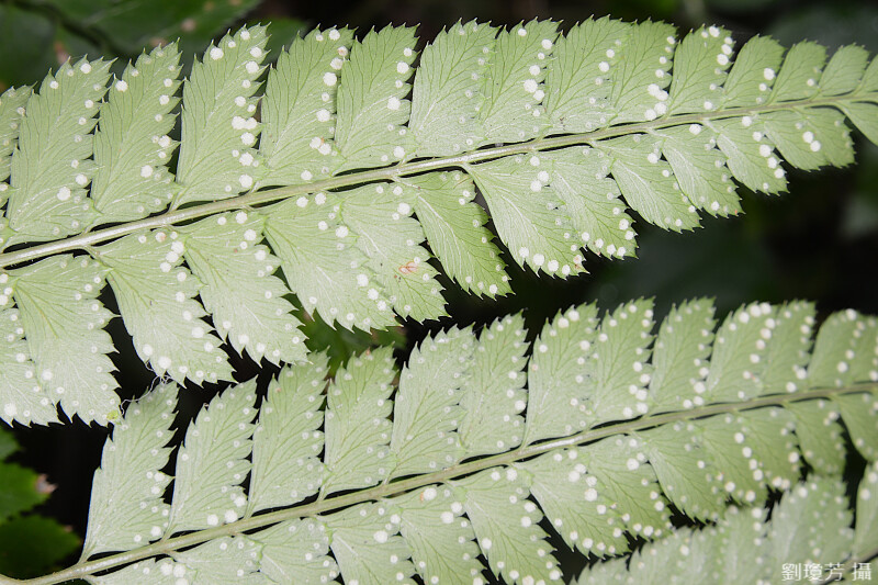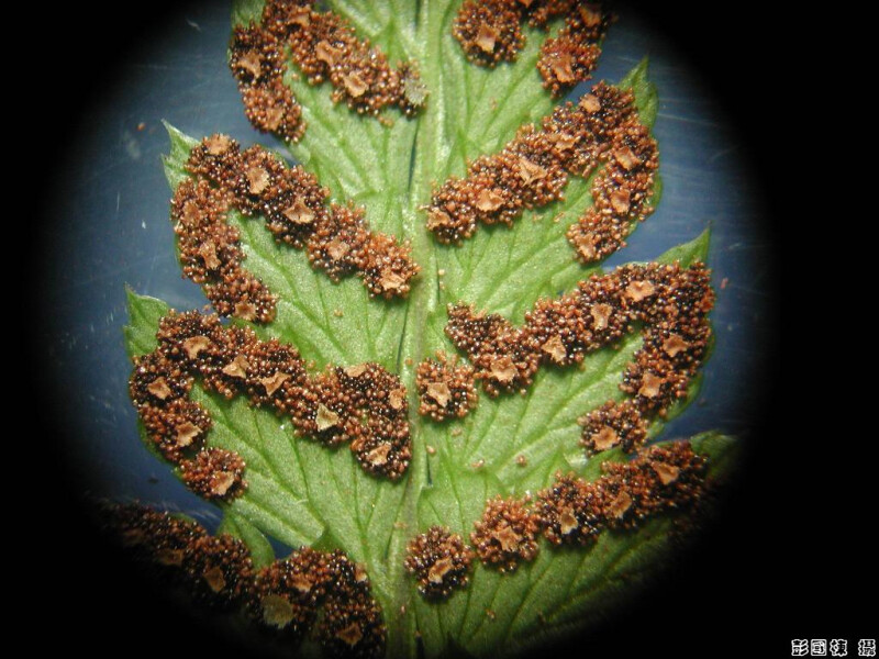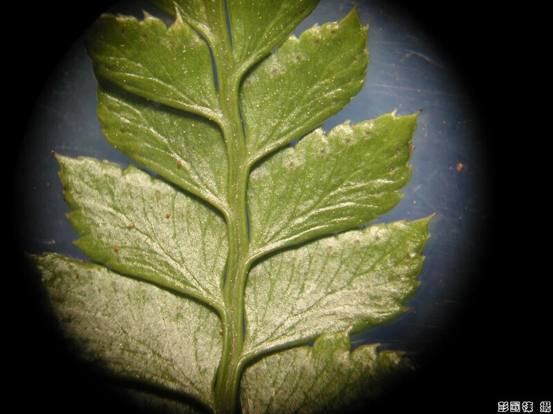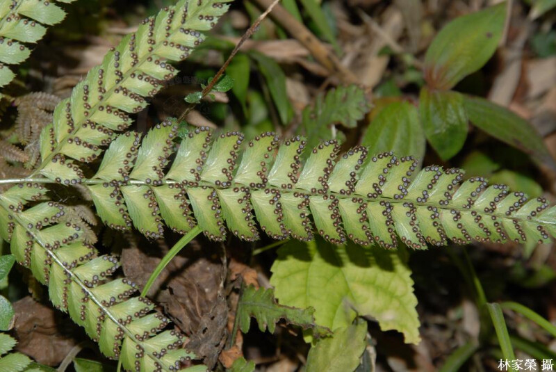 葉革質,基部羽片之基小羽片特別長,且分裂形式近似其它羽片,羽片邊緣具芒刺,頂羽片和側羽片同形,孢膜具指狀突出。 (郭城孟 1997)