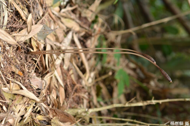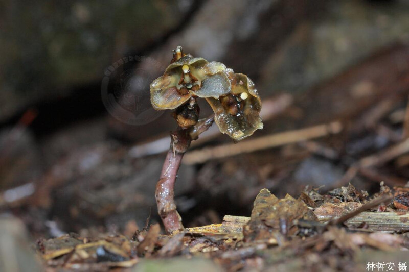 地下莖長柱形。花序高2-5 cm;花序柄黑色,具數個節間,具1-3朵花。花易脆,寬1.6 cm,黑褐,半直立狀,鐘形,外表光滑,離生之萼片頗為伸展;萼片全長2-3連接;離生之花瓣部分甚小。花柄於結果時延伸可達50cm,灰白色。 (林讚標 2001)