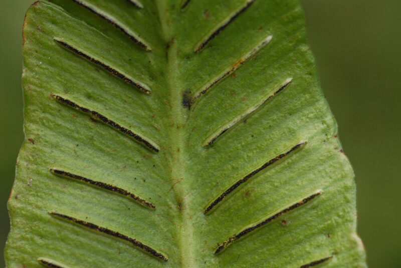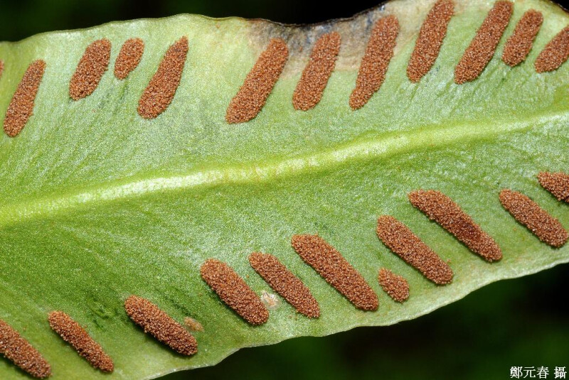植株叢生,葉革質,單葉,脈不明顯,葉基心型,具明顯之柄,孢膜中央縱裂。 (郭城孟 1997)