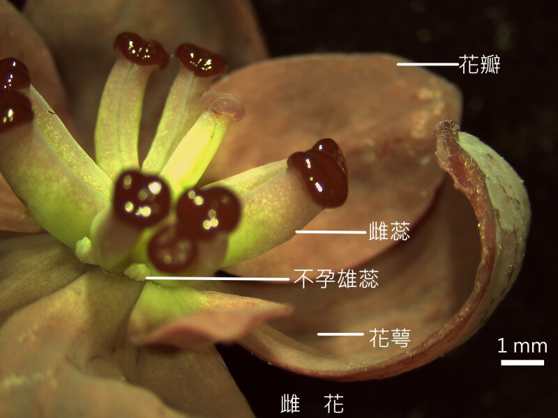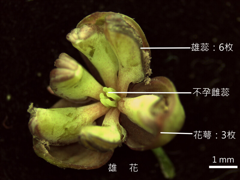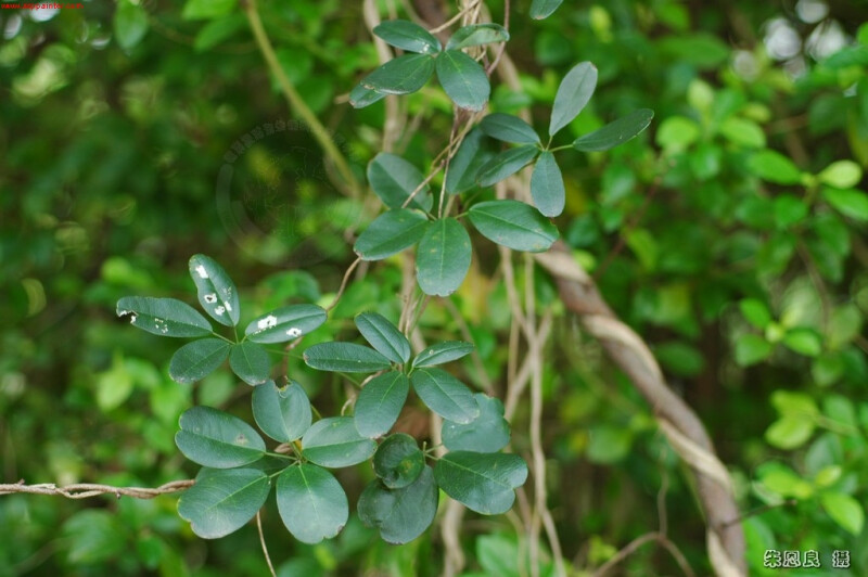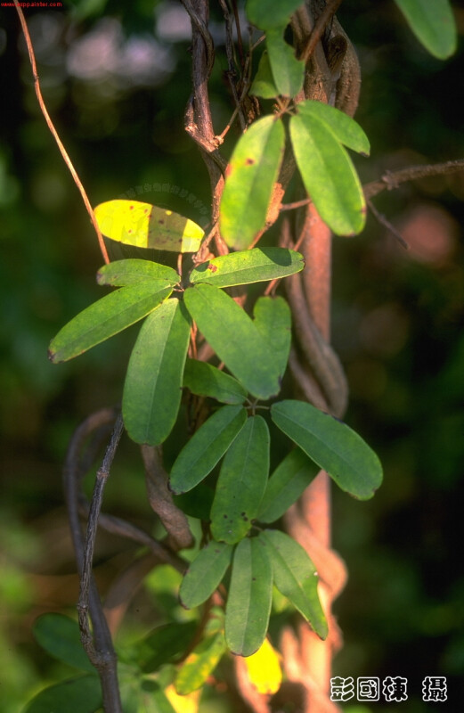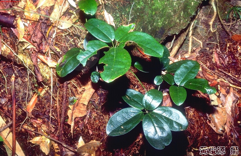 小葉5片,稀3或4片,長橢圓形至倒卵狀長橢圓形,前端凹。雌花心皮9枚。 (楊遠波、劉和義、呂勝由 1997)