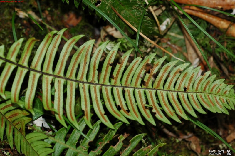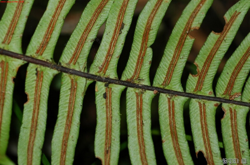 長走莖,具暗褐色鱗片,植株小型,約在50cm以下,羽片基部相連,多少具翅,下羽片漸縮,柄長。孢子囊群沿羽軸生長。 (郭城孟 1997)