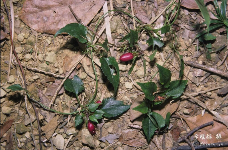 葉卵至披針形,漸尖頭,基部圓至淺心形。花冠淡黃白色,長3.5-4 cm。漿果近球形,長1-1.8 cm。 (楊遠波、劉和義、施炳霖、呂勝由 1999)