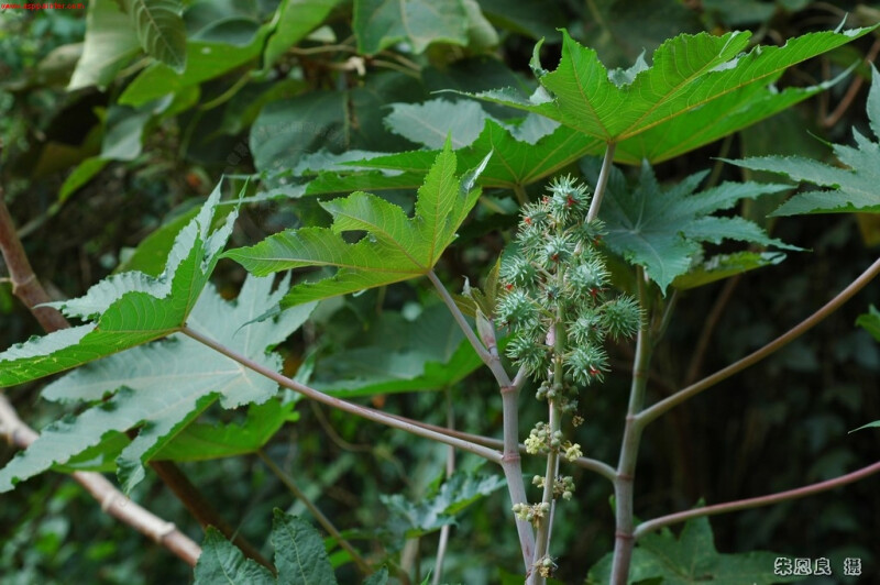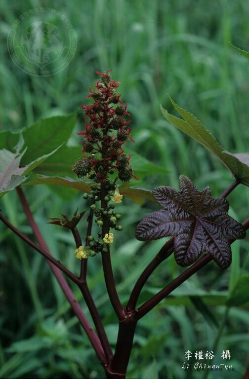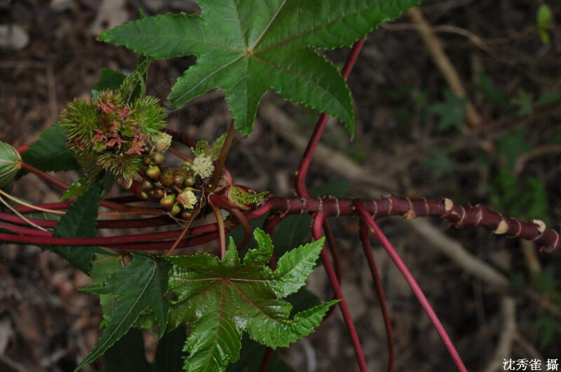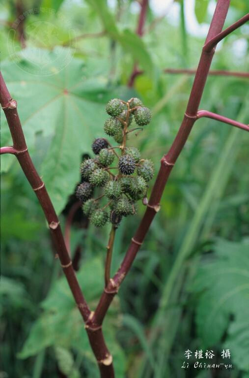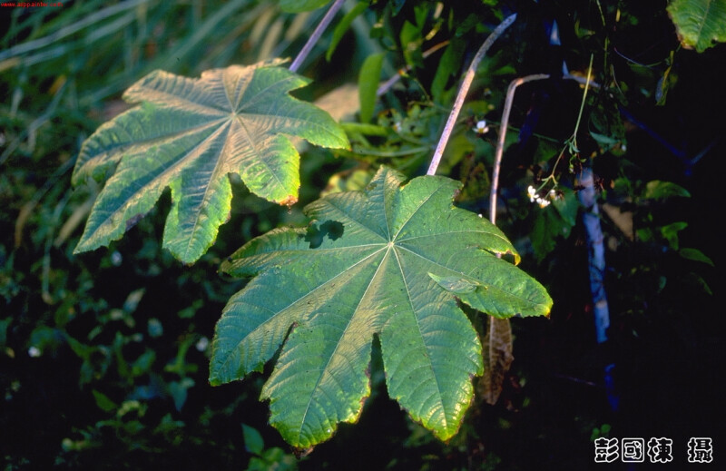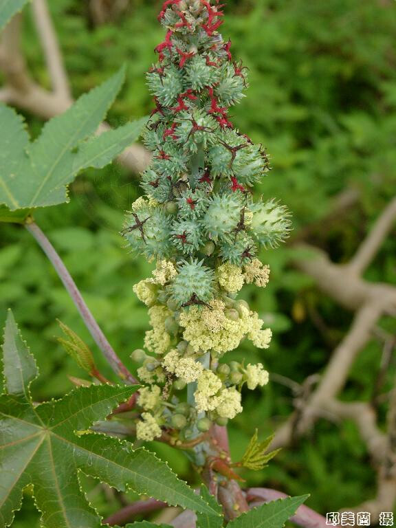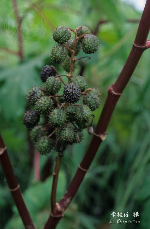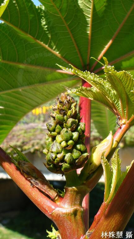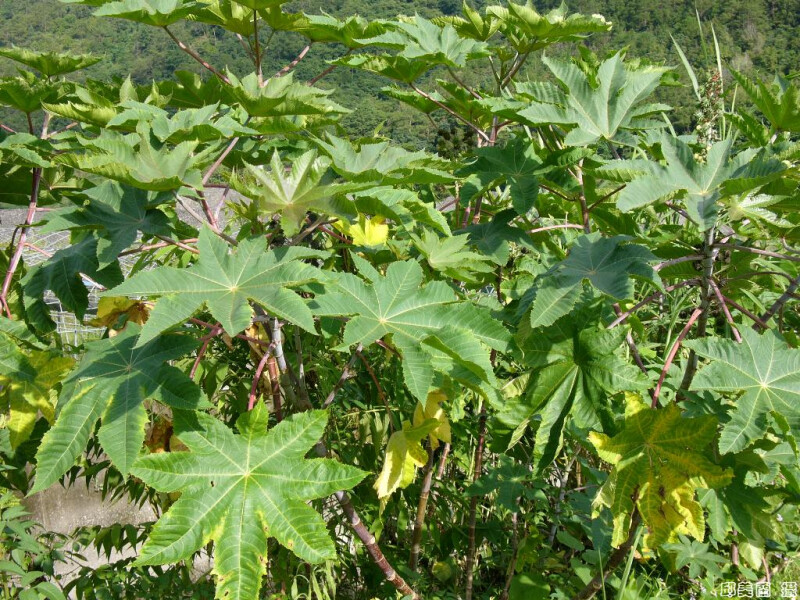 屬特徵- 灌木,光滑。葉盾狀,圓卵形,掌狀分裂;托葉合生,脫落後形成環狀痕跡。花無花瓣,成總狀花序,雄花生於下方,雌花生於上方。雄花萼球形,3-5裂;雄蕊多數。雌花萼片5,早落;子房3室。蒴果,3裂。 種特徵- 莖中空,幼時密被白粉。葉直徑20-60 cm,掌裂,裂片7-11,先端漸尖,鋸齒緣,齒尖具腺體。 (劉和義、楊遠波、呂勝由、施炳霖 1998)