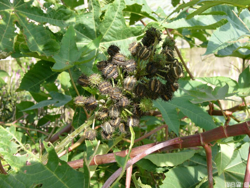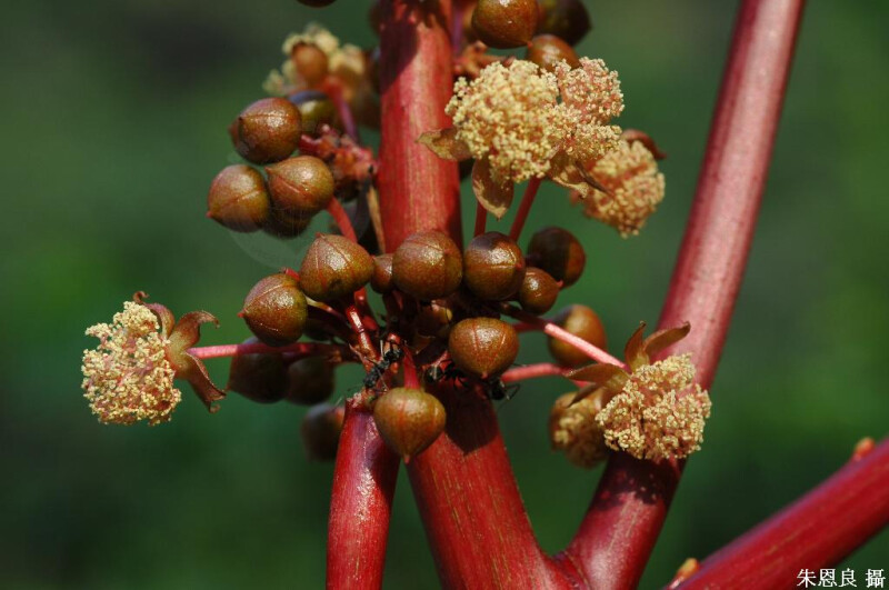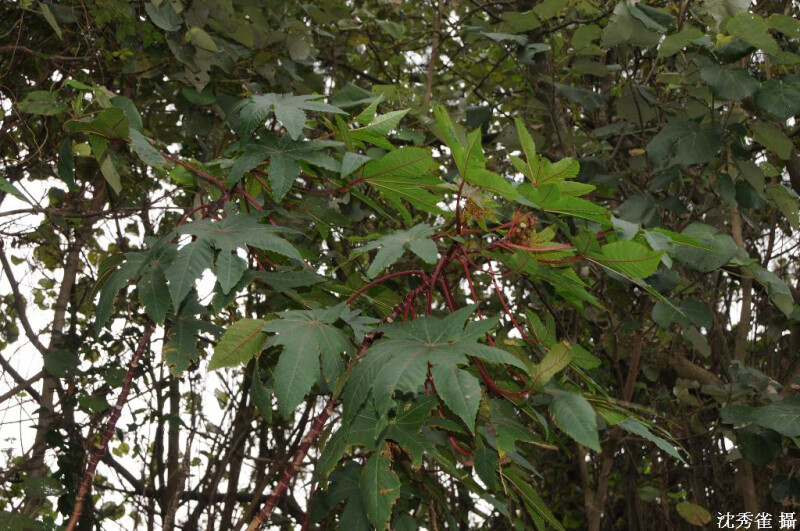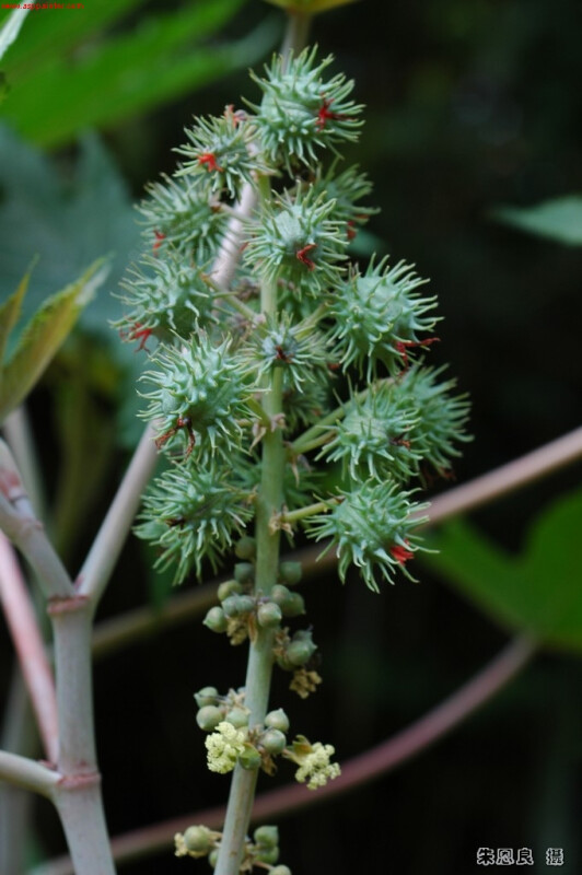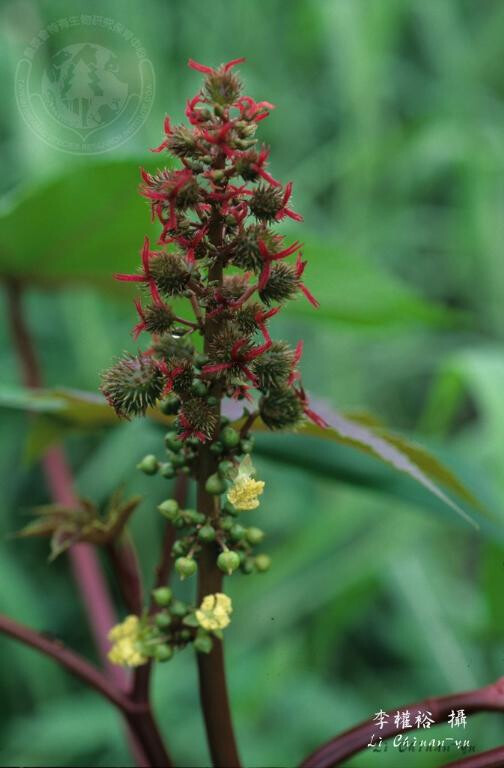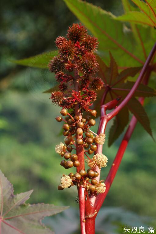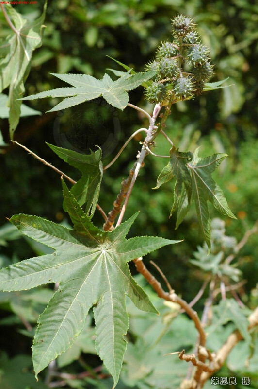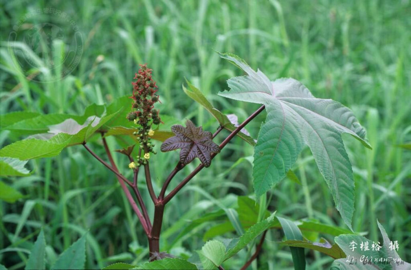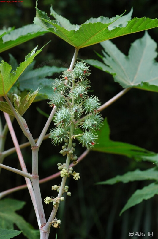 屬特徵- 灌木,光滑。葉盾狀,圓卵形,掌狀分裂;托葉合生,脫落後形成環狀痕跡。花無花瓣,成總狀花序,雄花生於下方,雌花生於上方。雄花萼球形,3-5裂;雄蕊多數。雌花萼片5,早落;子房3室。蒴果,3裂。 種特徵- 莖中空,幼時密被白粉。葉直徑20-60 cm,掌裂,裂片7-11,先端漸尖,鋸齒緣,齒尖具腺體。 (劉和義、楊遠波、呂勝由、施炳霖 1998)
