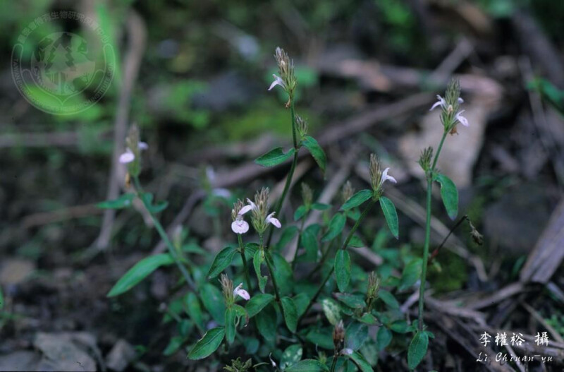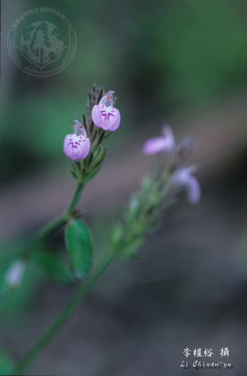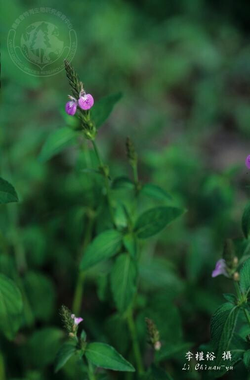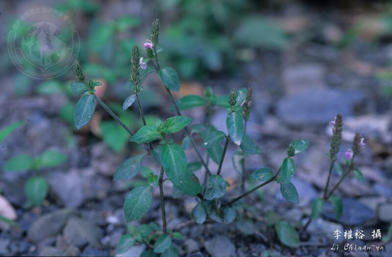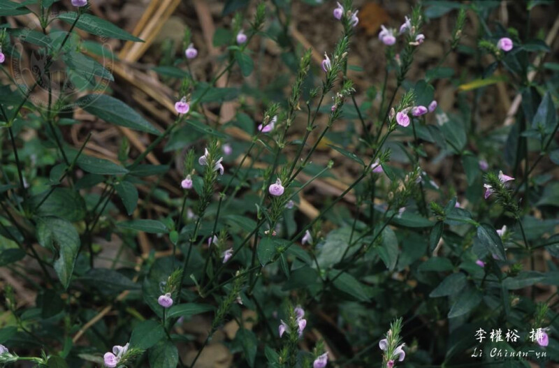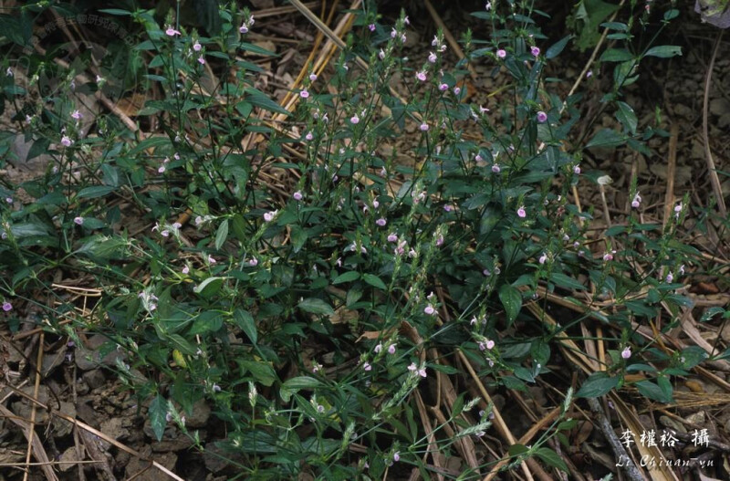 草本,被刺毛。葉長橢圓狀橢圓形,卵或圓形,長1.3-4.5 cm,先端銳尖,基部銳尖或圓,上表面具橫列針狀鐘乳體。花粉紅色或淡藍紫色。 (楊遠波、劉和義、施炳霖、呂勝由 1999)