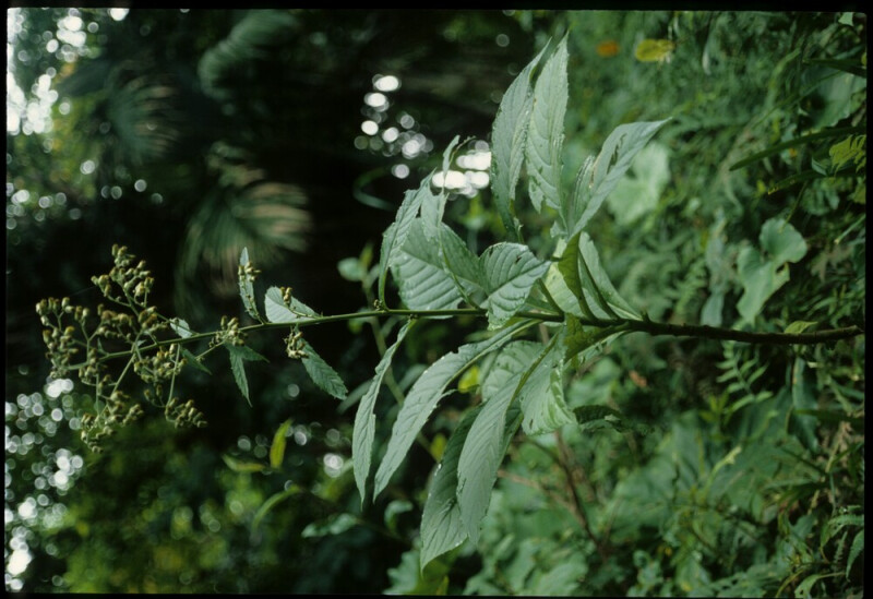 多年生直立亞灌木,株高2.5-3.5 m。葉長橢圓形,30-45 ?e 10-15 cm,葉緣重鋸齒,上表面疏被直毛,下表面柔毛。頭花頂生及腋生,鬆散圓錐狀排列,心花黃色。 (楊遠波、劉和義、施炳霖、呂勝由 1999)