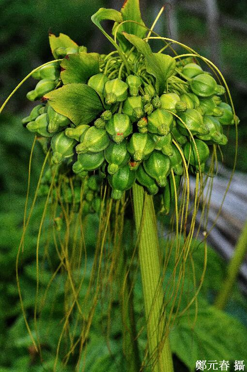科特徵- 多年生草本;地下莖塊狀。葉基生,大,羽狀或掌狀分裂,具長柄。花序生於生殖莖上,具2輪總苞;小苞片20-40,長線形,花後脫落。花多數,黃白色,具長梗;花被宿存;雄蕊白至紫色;雌蕊具環形花盤;子房具稜;柱頭白至紫色。漿果,球形,淡橘黃色;種子多數,扁圓形,具縱紋。 種特徵- 葉1-3片,直徑達150 cm,掌裂後再弱裂;葉柄中空具縱條紋。 (楊遠波、劉和義、林讚標 2001)